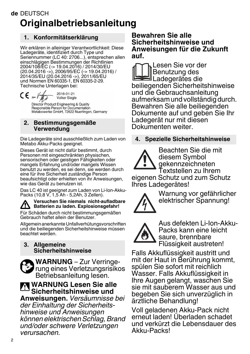 Le LC 40 convient pour charger des blocs batteries Li-Ion (10,8 V, 1,5 Ah - 5,2Ah, 3 éléments). Ne jamais essayer de charger des piles non rechargeables. Danger d'explosion ! L'utilisateur sera entièrement responsable de tous dommages résultant d'une utilisation non conforme à la destination de la machine. Il est impératif de respecter les consignes générales de protection contre les accidents ainsi que les consignes de sécurité ci-jointes.