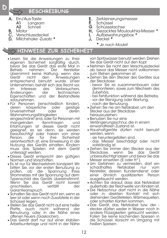 • Lesen Sie die Anweisungen zu Ihrer eigenen Sicherheit sorgfältig durch, bevor Sie das Gerät das erste Mal in Betrieb nehmen: Der Hersteller übernimmt keine Haftung, wenn das Gerät nicht den Anweisungen entsprechend benutzt wurde. Unser Unternehmen, behält sich das Recht vor, im Interesse des Verbrauchers, Änderungen der technischen Eigenschaften und der Bestandteile vorzunehmen. • Für Personen (einschließlich Kinder), deren körperliche oder geistige Unversehrtheit oder deren Wahrnehmungsfähigkeiten eingeschränkt sind, oder für Personen mit mangelnden Kenntnissen und Erfahrungen ist dieses Gerät nicht geeignet, es sei denn, sie werden beaufsichtigt oder haben von einer Person, die für ihre Sicherheit verantwortlich ist, eine Einweisung in die Nutzung des Geräts erhalten. Kindern muss das Spielen mit dem Gerät untersagt werden. • Dieses Gerät entspricht den gültigen Normen und Vorschriften. • Es ist nur für Wechselstrom konzipiert. Wir bitten Sie, vor der ersten Benutzung zu prüfen, ob die Spannung Ihres Stromnetzes mit der Spannung auf dem Typenschild des Geräts übereinstimmt. Wenn Sie das Gerät nicht korrekt anschließen, verfällt der Garantieanspruch. • Schalten Sie das Gerät nicht ein, wenn es leer ist oder wenn noch Zusatzteile in der Schüssel liegen. • Stellen Sie das Gerät nicht auf eine heiße Platte, auch nicht während der Benutzung, oder in die Nähe eines offenen Feuers (Gaskocher). • Das Gerät darf nur auf einer stabilen Arbeitsunterlage und nicht in der Nähe
