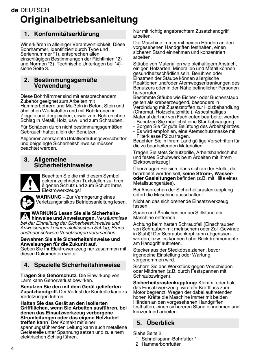 2. Utilisation conforme à la destination Equipé des accessoires correspondants, ces perceuses à percussion sont prévues pour travailler avec des forets marteau et des burins dans le béton, la pierre ou des matériaux similaires, et avec des trépans dans les tuiles, etc., ainsi que pour percer sans percussion dans le métal, le bois, etc. ou pour serrer des vis. L'utilisateur sera entièrement responsable de tous dommages résultant d'une utilisation non conforme à la destination de l'appareil. Il est impératif de respecter les consignes générales de protection contre les accidents ainsi que les consignes de sécurité ci-jointes.