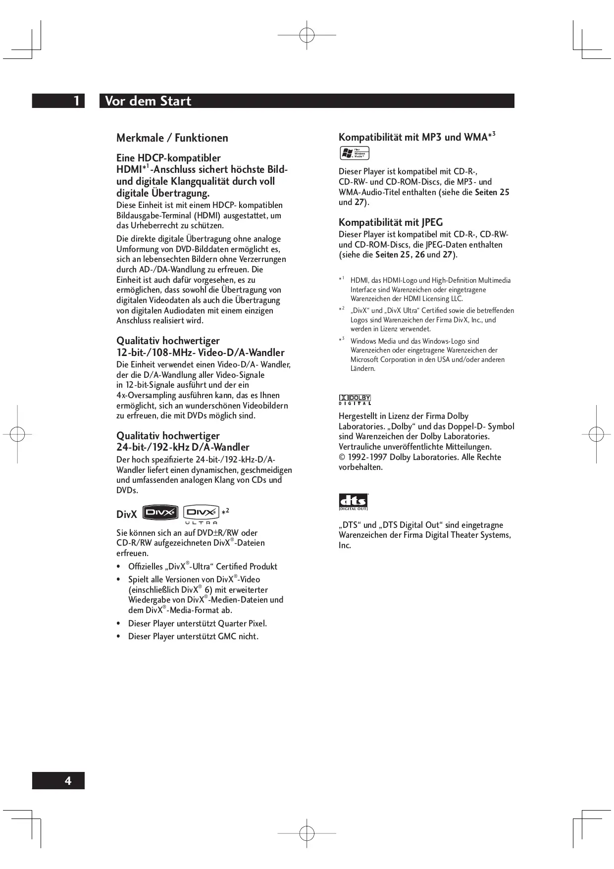Vor dem Start Merkmale / Funktionen Eine HDCP-kompatibler HDMI*1-Anschluss sichert höchste Bildund digitale Klangqualität durch voll digitale Übertragung. Diese Einheit ist mit einem HDCP- kompatiblen Bildausgabe-Terminal (HDMI) ausgestattet, um das Urheberrecht zu schützen. Die direkte digitale Übertragung ohne analoge Umformung von DVD-Bilddaten ermöglicht es, sich an lebensechten Bildern ohne Verzerrungen durch AD-/DA-Wandlung zu erfreuen. Die Einheit ist auch dafür vorgesehen, es zu ermöglichen, dass sowohl die Übertragung von digitalen Videodaten als auch die Übertragung von digitalen Audiodaten mit einem einzigen Anschluss realisiert wird. Qualitativ hochwertiger 12-bit-/108-MHz- Video-D/A-Wandler Die Einheit verwendet einen Video-D/A- Wandler, der die D/A-Wandlung aller Video-Signale in 12-bit-Signale ausführt und der ein 4x-Oversampling ausführen kann, das es Ihnen ermöglicht, sich an wunderschönen Videobildern zu erfreuen, die mit DVDs möglich sind. Qualitativ hochwertiger 24-bit-/192-kHz D/A-Wandler Der hoch spezifizierte 24-bit-/192-kHz-D/AWandler liefert einen dynamischen, geschmeidigen und umfassenden analogen Klang von CDs und DVDs. DivX Dieser Player ist kompatibel mit CD-R-, CD-RW- und CD-ROM-Discs, die MP3- und WMA-Audio-Titel enthalten (siehe die Seiten 25 und 27). Kompatibilität mit JPEG Dieser Player ist kompatibel mit CD-R-, CD-RWund CD-ROM-Discs, die JPEG-Daten enthalten (siehe die Seiten 25, 26 und 27). *1 HDMI, das HDMI-Logo und High-Definition Multimedia Interface sind Warenzeichen oder eingetragene Warenzeichen der HDMI Licensing LLC. *2 „DivX“ und „DivX Ultra“ Certified sowie die betreffenden Logos sind Warenzeichen der Firma DivX, Inc., und werden in Lizenz verwendet. *3 Windows Media und das Windows-Logo sind Warenzeichen oder eingetragene Warenzeichen der Microsoft Corporation in den USA und/oder anderen Ländern. Hergestellt in Lizenz der Firma Dolby Laboratories. „Dolby“ und das Doppel-D- Symbol sind Warenzeichen der Dolby Laboratories. Vertrauliche unveröffentlichte Mitteilungen. © 1992-1997 Dolby Laboratories. Alle Rechte vorbehalten.