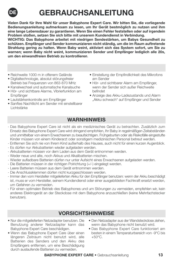 WARNHINWEIS - Das Babyphone Expert Care ist nicht als ein medizinisches Gerät zu betrachten. Zusätzlich zum Einsatz des Babyphone Expert Care wird dringend empfohlen, Ihr Baby in regelmäßigen Zeitabständen und unmittelbar von einem Erwachsenen zu beaufsichtigen. Frühgeburten oder als Risikofälle eingestufte Kinder müssen von einem Kinderarzt oder sonstigem medizinischen Personal betreut werden. - Entfernen Sie sich nie von Ihrem Kind außerhalb des Hauses, auch nicht für einen kurzen Augenblick. - Es dürfen nur Akkubatterien wieder aufgeladen werden. - Akkubatterien müssen vor dem Laden aus dem Gerät entnommen werden. - Weder neue und alte, noch Akkus und Alkalibatterien mischen. - Wieder aufladbare Batterien dürfen nur unter Aufsicht eines Erwachsenen aufgeladen werden. - Die Batterien müssen in der richtigen Polrichtung (+/-) eingelegt werden. - Leere Batterien müssen aus dem Gerät entnommen werden. - Die Anschlussklemmen dürfen nicht kurzgeschlossen werden. - Immer den vom Hersteller mitgelieferten Akku für den Empfänger benutzen: wenn der Akku beschädigt ist, muss er vom Hersteller, seinem Kundendienst oder einer ausgebildeten Fachkraft ersetzt werden, um Gefahren zu vermeiden. - Für einen optimalen Betrieb des Babyphones und um Störungen zu vermeiden, empfehlen wir, kein anderes Elektrogerät an der Steckdose mit dem Babyphone anzuschließen (keine Mehrfachstecker benutzen).