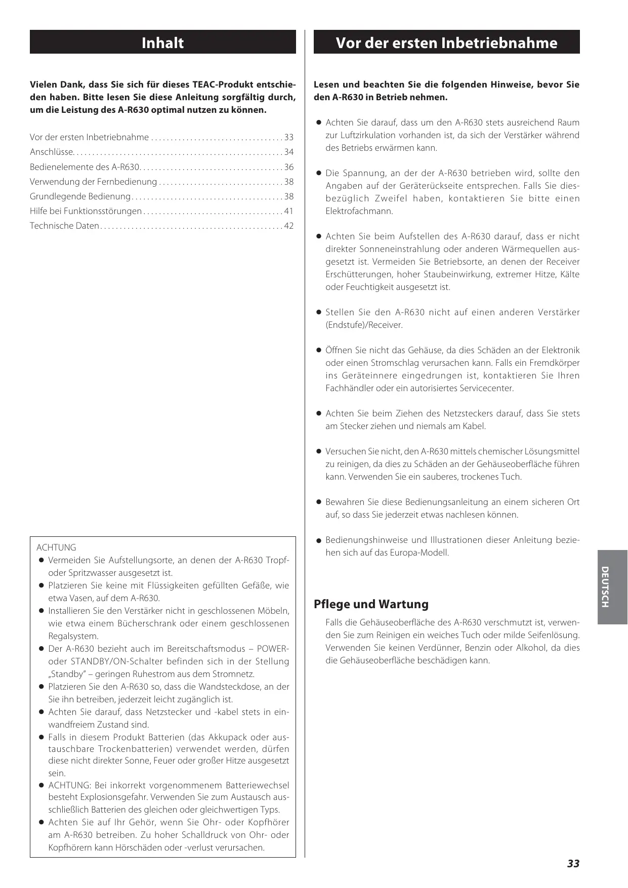 Vor der ersten Inbetriebnahme . . . . . . . . . . . . . . . . . . . . . . . . . . . . . . . . . . 33 Anschlüsse. . . . . . . . . . . . . . . . . . . . . . . . . . . . . . . . . . . . . . . . . . . . . . . . . . . . . . 34 Bedienelemente des A-R630 . . . . . . . . . . . . . . . . . . . . . . . . . . . . . . . . . . . . . 36 Verwendung der Fernbedienung . . . . . . . . . . . . . . . . . . . . . . . . . . . . . . . . 38 Grundlegende Bedienung . . . . . . . . . . . . . . . . . . . . . . . . . . . . . . . . . . . . . . . 38 Hilfe bei Funktionsstörungen . . . . . . . . . . . . . . . . . . . . . . . . . . . . . . . . . . . . 41 Technische Daten . . . . . . . . . . . . . . . . . . . . . . . . . . . . . . . . . . . . . . . . . . . . . . . 42