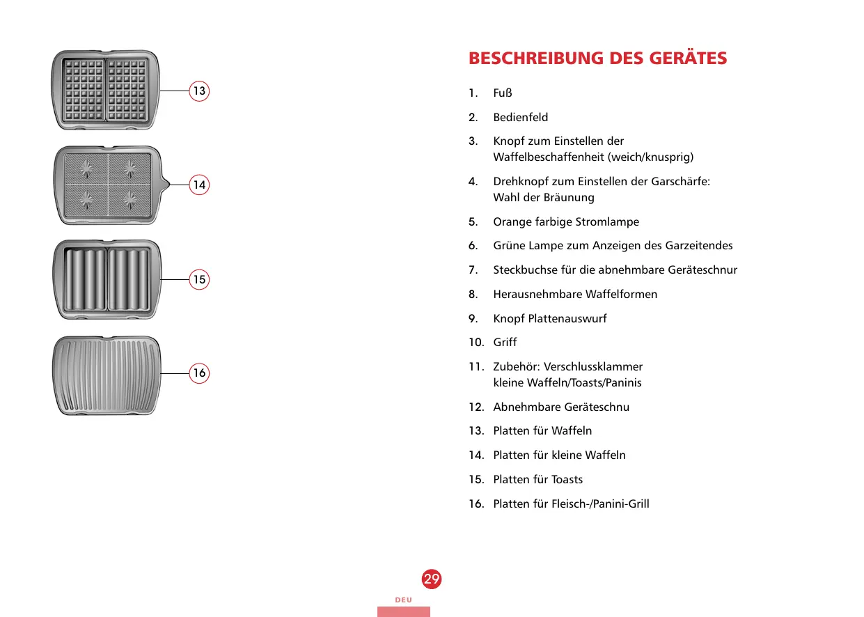 DEU SICHERHEITSHINWEIS **Das Gerät nicht im Freien benutzen oder abstellen, es muss trocken untergebracht werden. **Das Gerät nicht an seiner Schnur ziehen. Darauf achten, dass niemand an der Geräteschnur hängen bleiben und das Gerät nicht heruntergezogen werden kann. Die Schnur nicht um das Gerät wickeln, nicht verdrehen und nicht mit den heißen Platten in Berührung bringen. **Wenn das Gerät eingeschaltet ist, die Metallteile nicht berühren, denn sie sind heiß. **Personen (einschließlich Kinder ab acht Jahren), deren physische, sensorische oder geistige Fähigkeiten eingeschränkt sind oder die nicht über die erforderliche Erfahrung und das nötige Wissen verfügen, dürfen das Gerät nur verwenden, sofern sie beaufsichtigt werden oder Anweisungen bezüglich der sicheren Benutzung des Geräts erhalten haben und die Gefahren verstehen. Kinder nicht mit dem Gerät spielen lassen. Nur Kinder, die mindestens acht Jahre alt sind, dürfen unter Aufsicht eines Erwachsenen Reinigung und Instandhaltung des Geräts übernehmen. Diese Bedienungsanweisung aufmerksam durchlesen und zum späteren Nachlesen aufbewahren. **Darauf achten, dass die Netzspannung mit den Angaben auf dem Geräteschild übereinstimmt. **Die Geräteschnur stets vollkommen abwickeln. **Eine Verlängerungsschnur darf nur benutzt werden, wenn sie einen Masseanschluss und einen Drahtquerschnitt von mindestens 0,75mm² besitzt. **Das Gerät von leicht entflammbaren Gegenständen entfernt aufstellen (Gardinen…). **Das Gerät darf nicht auf einer heißen Fläche oder in der Nähe einer Flamme stehen. **Das Gerät nicht unbeaufsichtigt eingeschaltet lassen. **Das Gerät nur für Haushaltszwecke und entsprechend den Hinweisen der Bedienungsanleitung benutzen. **Das Gerät weder zum Reinigen noch aus einem anderen Grund in Wasser oder eine sonstige Flüssigkeit eintauchen. Nicht in der Spülmaschine reinigen.