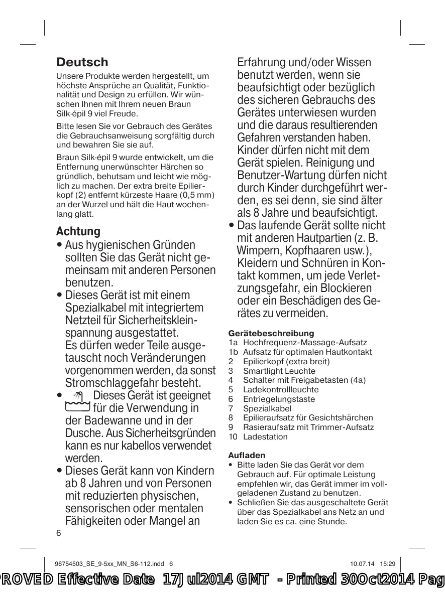 Lisez attentivement toutes les instructions avant d’utiliser l’appareil et conservez-les dénuées d’expérience ou de en cas de besoin. connaissance, si elles ont pu Braun Silk·épil 9 a été conçu pour rendre bénéficier, par l’intermédiaire l’épilation aussi efficace, douce et facile d’une personne responsable que possible. La tête d’épilation extra de leur sécurité, d’une surveillarge enlève les poils les plus courts (0,5 mm) à la racine, laissant votre peau lance ou d’instructions préadouce durant plusieurs semaines. lables concernant l’utilisation de l’appareil en toute sécurité Important et les dangers encourus. Les • Pour des raisons d’hygiène, ne enfants ne doivent pas jouer partagez pas cet appareil avec avec l’appareil. Le nettoyage et d’autres personnes. l’entretien ne doivent pas être • Cet appareil est équipé d’un faits par des enfants, à moins câble spécifique avec alimenqu’ils ne soient âgés de plus tation intégrée dont la tension de 8 ans et qu’ils ne soient est très basse pour des raisons sous surveillance. de sécurité. Ne changez ni ne • Lorsqu’il est en marche, l’apmanipulez aucune des pièces. pareil ne doit jamais entrer en Dans le cas contraire, vous contact avec vos cheveux, risquerez de recevoir une vos cils, vos rubans à cheveux, décharge électrique. Pour les etc. afin d’éviter tout risque de spécifications électriques, voir blessure ainsi que tout blocage inscriptions sur le câble spéciou dommage sur l’appareil. fique. Le câble spécifique s’adapte automatiquement à Description n’importe quelle tension AC 1a Rouleaux massants haute fréquence 1b Accessoire de contact avec la peau dans le monde. 2 Tête d’épilation extra large • Cet appareil peut être 3 Lumière Smartlight utilisé dans le bain com 4 Interrupteur avec boutons de verrouillage (4a) me sous la douche. Pour des 5 Indicateur de charge raisons de sécurité, utilisez 6 Bouton d’éjection l’appareil uniquement sans fil. 7 Cordon d’alimentation spécial 17