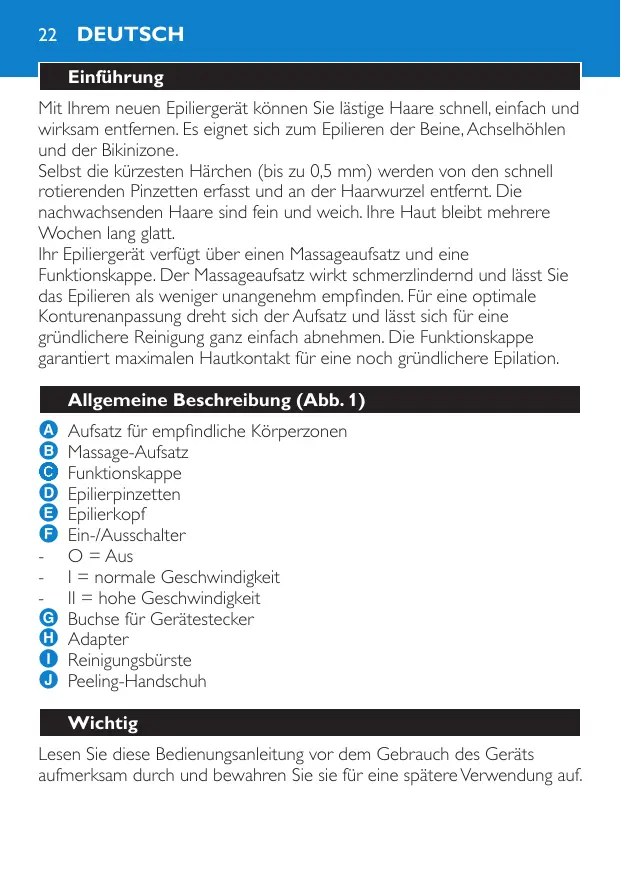 Deutsch Einführung Mit Ihrem neuen Epiliergerät können Sie lästige Haare schnell, einfach und wirksam entfernen. Es eignet sich zum Epilieren der Beine, Achselhöhlen und der Bikinizone. Selbst die kürzesten Härchen (bis zu 0,5 mm) werden von den schnell rotierenden Pinzetten erfasst und an der Haarwurzel entfernt. Die nachwachsenden Haare sind fein und weich. Ihre Haut bleibt mehrere Wochen lang glatt. Ihr Epiliergerät verfügt über einen Massageaufsatz und eine Funktionskappe. Der Massageaufsatz wirkt schmerzlindernd und lässt Sie das Epilieren als weniger unangenehm empfinden. Für eine optimale Konturenanpassung dreht sich der Aufsatz und lässt sich für eine gründlichere Reinigung ganz einfach abnehmen. Die Funktionskappe garantiert maximalen Hautkontakt für eine noch gründlichere Epilation. Allgemeine Beschreibung (Abb. 1)