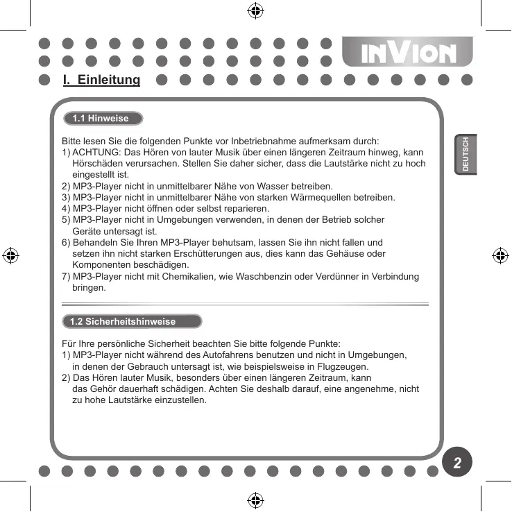1) MP3-Player nicht während des Autofahrens benutzen und nicht in Umgebungen,