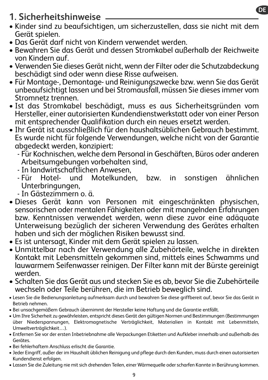 - Um Ihre Sicherheit zu gewährleisten, entspricht dieses Gerät den gültigen Normen und Bestimmungen (Bestimmungen über Niederspannungen, Elektromagnetische Verträglichkeit, Materialien in Kontakt mit Lebenmitteln, Umweltverträglichkeit…).