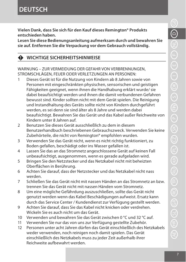 WARNUNG – ZUR VERMEIDUNG DER GEFAHR VON VERBRENNUNGEN, STROMSCHLÄGEN, FEUER ODER VERLETZUNGEN AN PERSONEN: Dieses Gerät ist für die Nutzung von Kindern ab 8 Jahren sowie von Personen mit eingeschränkten physischen, sensorischen und geistigen Fähigkeiten geeignet, wenn ihnen die Handhabung erklärt wurde/ sie dabei beaufsichtigt werden und ihnen die damit verbundenen Gefahren bewusst sind. Kinder sollten nicht mit dem Gerät spielen. Die Reinigung und Instandhaltung des Geräts sollte nicht von Kindern durchgeführt werden, es sei denn sie sind älter als 8 Jahre und werden dabei beaufsichtigt. Bewahren Sie das Gerät und das Kabel außer Reichweite von Kindern unter 8 Jahren auf. Benutzen Sie dieses Gerät ausschließlich zu dem in diesem Benutzerhandbuch beschriebenen Gebrauchszweck. Verwenden Sie keine Zubehörteile, die nicht von Remington® empfohlen wurden. Verwenden Sie das Gerät nicht, wenn es nicht richtig funktioniert, zu Boden gefallen, beschädigt oder ins Wasser gefallen ist. Lassen Sie das an das Stromnetz angeschlossene Gerät auf keinen Fall unbeaufsichtigt, ausgenommen, wenn es gerade aufgeladen wird. Bringen Sie den Netzstecker und das Netzkabel nicht mit beheizten Oberflächen in Berührung. Achten Sie darauf, dass der Netzstecker und das Netzkabel nicht nass werden. Schließen Sie das Gerät nicht mit nassen Händen an das Stromnetz an bzw. trennen Sie das Gerät nicht mit nassen Händen vom Stromnetz. Um eine mögliche Gefährdung auszuschließen, sollte das Gerät nicht genutzt werden wenn das Kabel Beschädigungen aufweist. Ersatz kann durch das Service Center / Kundendienst zur Verfügung gestellt werden. Achten Sie darauf, dass Sie das Kabel nicht knicken oder verdrehen. Wickeln Sie es auch nicht um das Gerät. 10 Verwenden und bewahren Sie das Gerät zwischen 0 °C und 32 °C auf. 11 Verwenden Sie nur das von uns zur Verfügung gestellte Zubehör. 12 Personen unter acht Jahren dürfen das Gerät einschließlich des Netzkabels weder verwenden, noch reinigen noch damit spielen. Das Gerät einschließlich des Netzkabels muss zu jeder Zeit außerhalb ihrer Reichweite aufbewahrt werden.