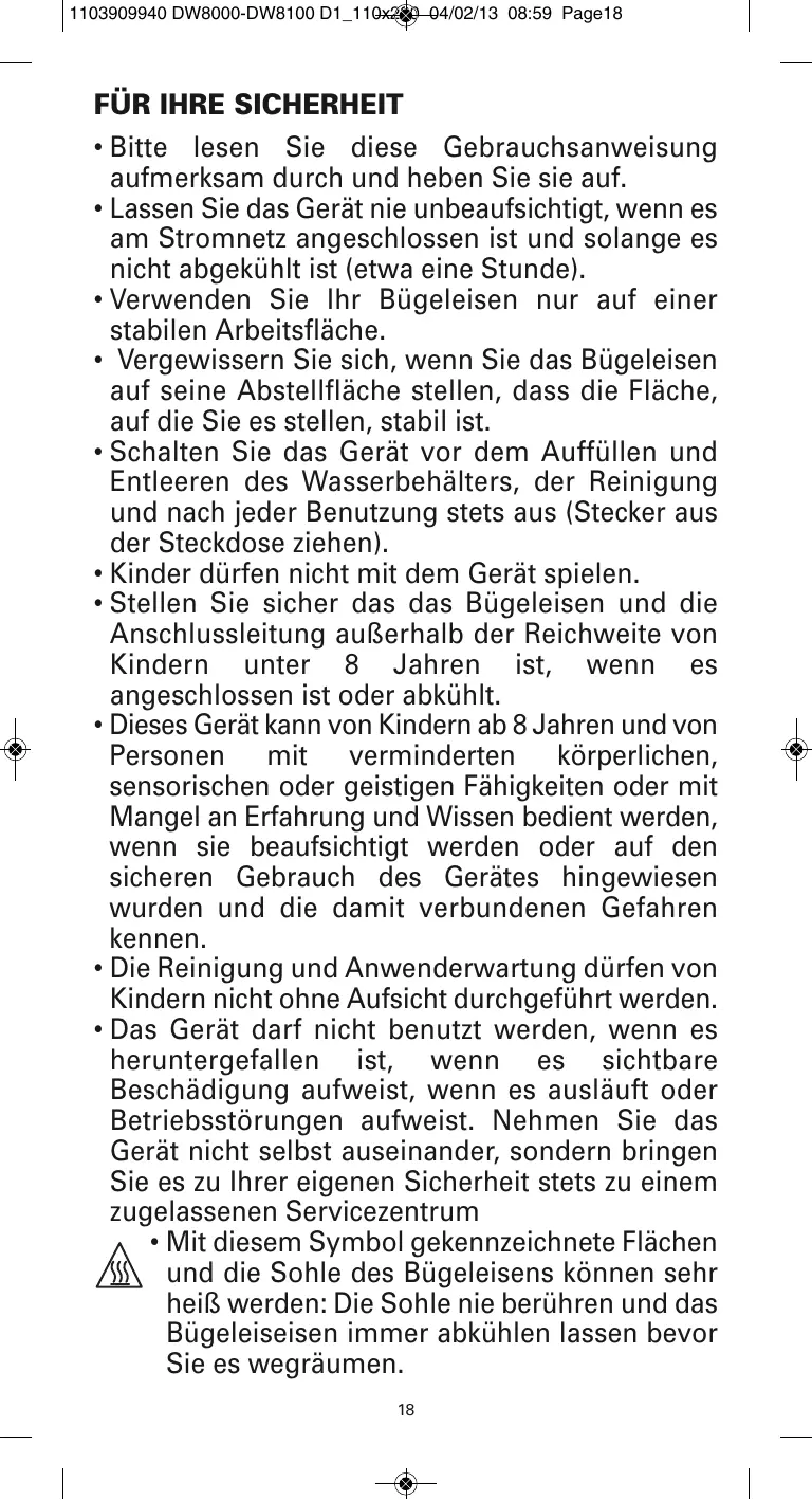 DW8115D1 - Bügeleisen ROWENTA - Kostenlose Bedienungsanleitung