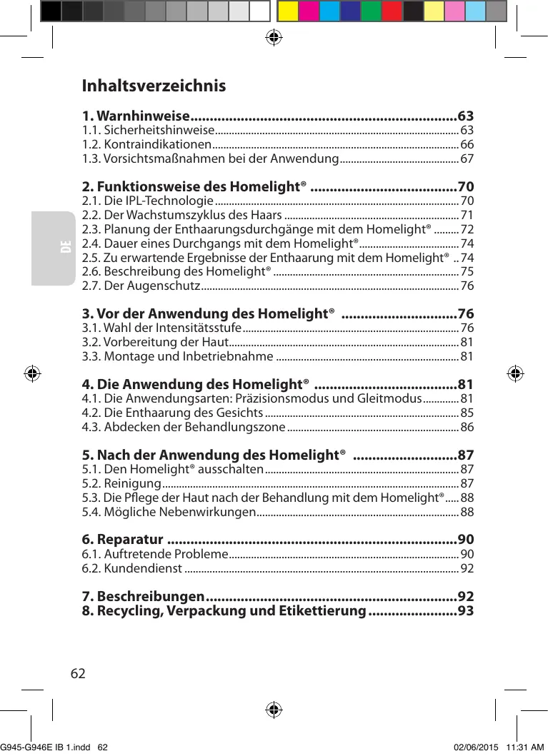 Anwendung des Homelight® Epilierers ab. 2.2. Der Wachstumszyklus des Haars 2.6. Beschreibung des Homelight®