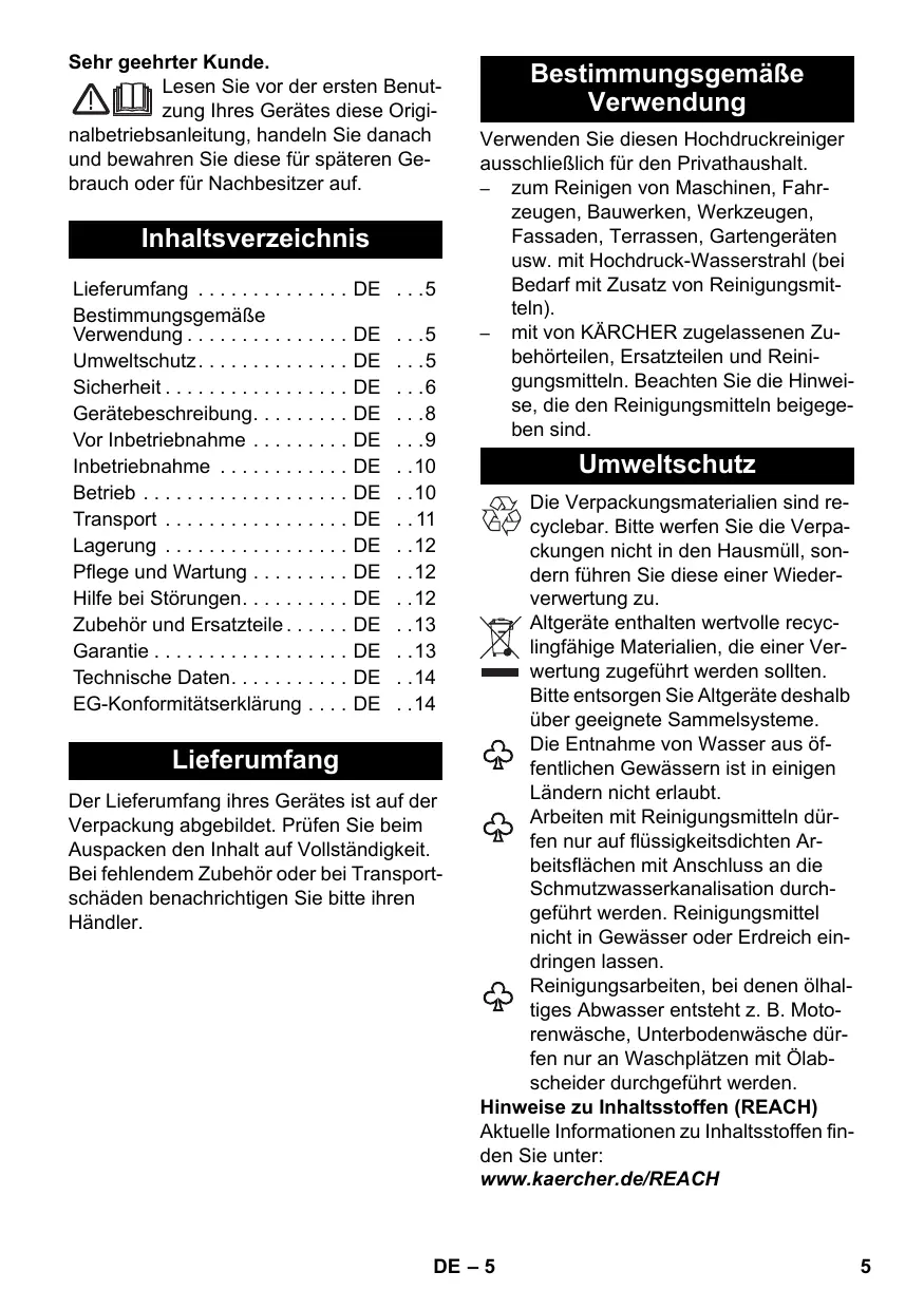 . . .5 . . .6 EN 60335–1 EN 60335–2–79 EN 61000–3–2: 2006+A1: 2009+A2: 2009 EN 61000–3–3: 2008 EN 62233: 2008 Angewandtes Konformitätsbewertungsverfahren 2000/14/EG: Anhang V Schallleistungspegel dB(A) EN 60335–1 EN 60335–2–79 EN 61000–3–2: 2006+A1: 2009+A2: 2009 EN 61000–3–3: 2008 EN 62233: 2008 Applied conformity evaluation method 2000/14/EC: Appendix V Sound power level dB(A) Measured: Ce nettoyeur haute pression ne doit être utilisé que pour un usage privé: – pour le nettoyage de machines, véhicules, bâtiments, outils, façades, terrasses, outils de jardinage etc. avec un jet d'eau sous pression (et si besoin en ajoutant des détergents). – avec des accessoires, pièces de rechange et détergents homologués par KÄRCHER. Veuillez respecter les consignes livrées avec les détergents.
