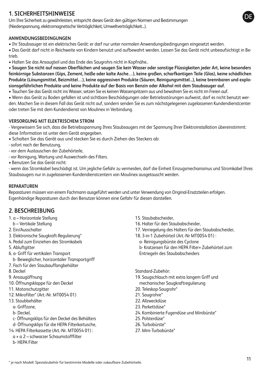 - using the electronic power regulator* (3): turn the switch on the electronic regulator* to set the suction power: towards maximum position for floors and minimum position for furniture and fragile fabrics – fig. 8. - with the mechanical power regulator on the grip: open the slider on the grip to manually reduce suction power, e.g.: on fragile surfaces… – fig. 9. STORING AND TRANSPORTING THE APPLIANCE • After use, stop your vacuum cleaner by pressing the On/Off pedal (2) and unplug it – fig. 10. Wind the power cord by pressing the cord winder pedal (4) – fig. 11. 1.1. LEEREN DES STAUBBEHÄLTERS Leeren Sie den Staubbehälter (13) nach jeder Benutzung aus. • Ziehen Sie den Öffnungsklips des Staubbehälters (13c) zum Öffnen nach oben - Abb. 16. • Nehmen Sie den Deckel (13b) ab - Abb. 17 und leeren Sie den Behälter über einem Abfalleimer aus - Abb. 18a. DE • Ziehen Sie gleichzeitig an beiden Öffnungsklips für die HEPA Filterkartusche (13d) - Abb. 19a. • Nehmen Sie den schwarzen Schaumstofffilter (14a) vom HEPA Filter (14b) ab - Abb. 19b. • Drehen Sie den HEPA Filter (14b) um und klopfen Sie ihn über einem Mülleimer aus - Abb. 30. • Kratzen Sie den Filter anschließend mit dem Zubehörteil* (18b) unter lauwarmem Wasser ab und lassen Sie den HEPA Filter 24 Stunden lang trocknen – Abb. 31. SE L’ASPIRAPOLVERE SI SPEGNE DURANTE L’ASPIRAZIONE • La sicurezza termica ha funzionato. Verificare che il tubo e il flessibile non siano ostruiti o che la cassetta per la polvere e i filtri non siano pieni. Lasciate raffreddare 30 minuti prima di rimettere in funzione l'aspirapolvere. Se persiste un problema, portare l’aspirapolvere al Centro Assistenza Autorizzato Moulinex più vicino. Per un elenco dei centri assistenza autorizzati, contattare il servizio consumatori al recapito indicato nel certificato di garanzia internazionale allegato. GARANZIA • Questo apparecchio è riservato unicamente a un uso casalingo e domestico; in caso d'utilizzo non appropriato o non conforme alle istruzioni per l'uso, il fabbricante non si assume nessuna responsabilità e la garanzia è annullata. - antes de cada limpieza, mantenimiento o cambio de filtro. • No utilice el aparato: - en caso de que el cable esté dañado. Para evitar cualquier peligro, el sistema de recogida y el cable de su aspiradora deberán cambiarse obligatoriamente en un Centro de Servicio Autorizado Moulinex. REPARACIONES Las reparaciones sólo deberán ser realizadas por especialistas con piezas de recambio originales. Reparar un aparato usted mismo puede provocar un peligro para el usuario.