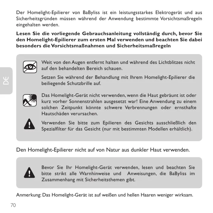 Veuillez porter la paire de lunettes de protection incluse lors de votre traitement avec l’épilateur Homelight. Ne pas utiliser l’appareil Homelight sur une peau bronzée ou après une exposition récente aux rayons du soleil! Un tel usage peut causer des brûlures graves ou des dommages sévères à la peau. Pour l’épilation du visage, veuillez utiliser uniquement le filtre spécial visage (disponible uniquement sur certains modèles).
