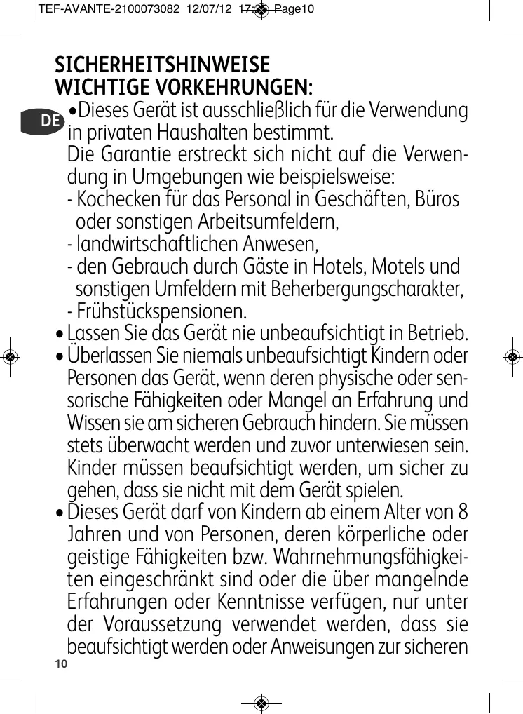 SICHERHEITSHINWEISE WICHTIGE VORKEHRUNGEN: •Dieses Gerät ist ausschließlich für die Verwendung DE in privaten Haushalten bestimmt. Die Garantie erstreckt sich nicht auf die Verwendung in Umgebungen wie beispielsweise: - Kochecken für das Personal in Geschäften, Büros oder sonstigen Arbeitsumfeldern, - landwirtschaftlichen Anwesen, - den Gebrauch durch Gäste in Hotels, Motels und sonstigen Umfeldern mit Beherbergungscharakter, - Frühstückspensionen. •Lassen Sie das Gerät nie unbeaufsichtigt in Betrieb. •Überlassen Sie niemals unbeaufsichtigt Kindern oder Personen das Gerät, wenn deren physische oder sensorische Fähigkeiten oder Mangel an Erfahrung und Wissen sie am sicheren Gebrauch hindern. Sie müssen stets überwacht werden und zuvor unterwiesen sein. Kinder müssen beaufsichtigt werden, um sicher zu gehen, dass sie nicht mit dem Gerät spielen. •Dieses Gerät darf von Kindern ab einem Alter von 8 Jahren und von Personen, deren körperliche oder geistige Fähigkeiten bzw. Wahrnehmungsfähigkeiten eingeschränkt sind oder die über mangelnde Erfahrungen oder Kenntnisse verfügen, nur unter der Voraussetzung verwendet werden, dass sie beaufsichtigt werden oder Anweisungen zur sicheren 10