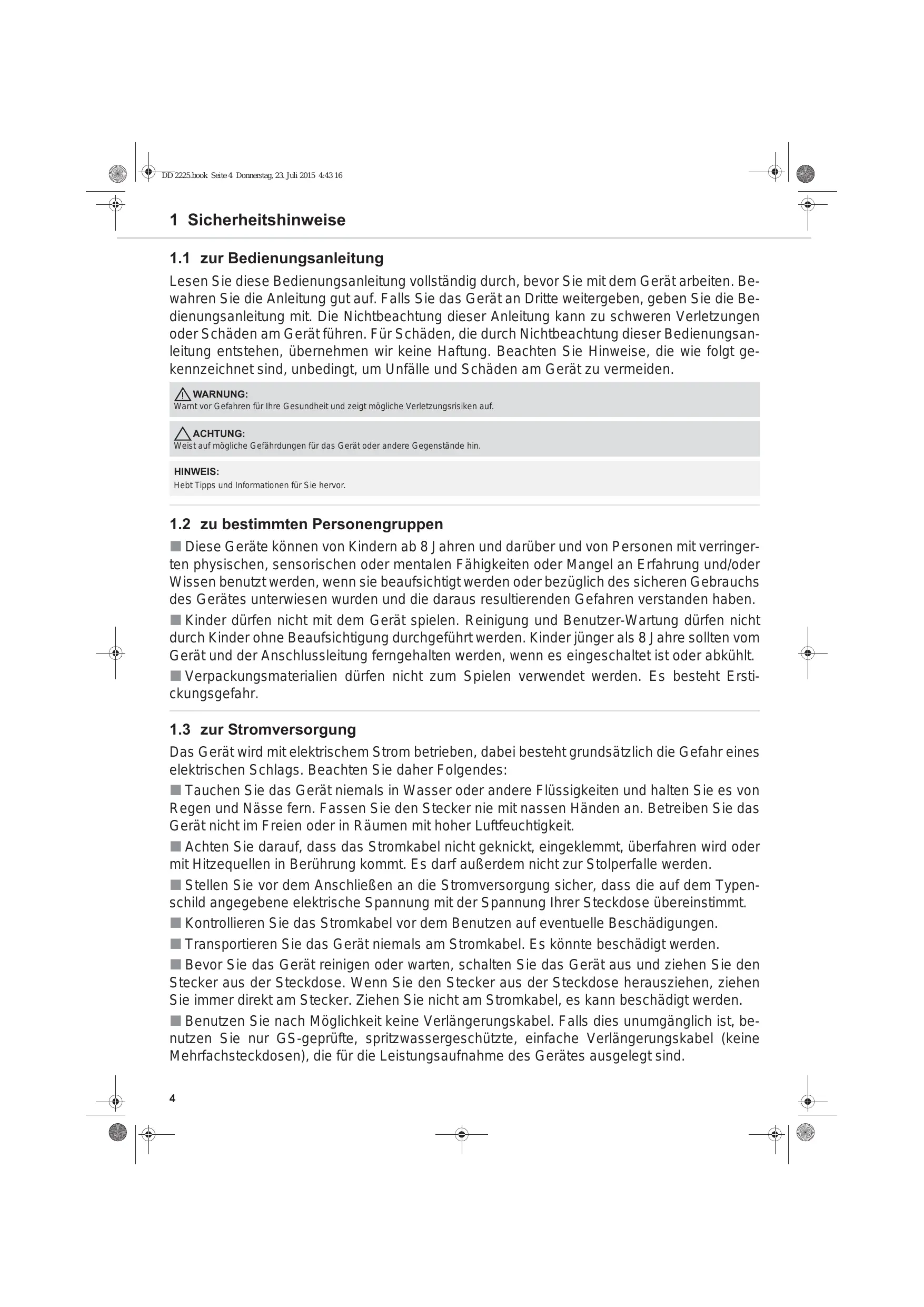Ces appareils peuvent être utilisés par des enfants d'au moins 8 ans et par des personnes se caractérisant par des capacités physiques, sensorielles ou mentales réduites ou disposant de peu d'expérience et/ou de connaissances. Elles doivent cependant avoir été rendues attentives à une utilisation sûre de cet appareil et des dangers qu'impliquent son utilisation. Les enfants ne doivent pas jouer avec cet appareil. Le nettoyage et l'entretien de l'appareil ne doivent pas être exécutés par des enfants si ceux-ci ne sont pas sous surveillance. Les enfants de moins de 8 ans ne doivent pas s'approcher de l'appareil ni de son cordon de branchement tant que celui-là est allumé ou en phase de refroidissement. Le matériel d'emballage ne doit pas être employé comme jouet. Il existe un risque d'asphyxie.