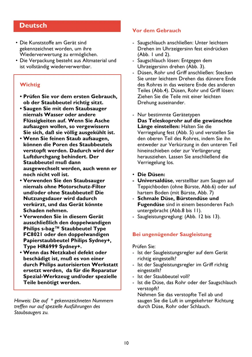 Wichtig • Prüfen Sie vor dem ersten Gebrauch, ob der Staubbeutel richtig sitzt. • Saugen Sie mit dem Staubsauger niemals Wasser oder andere Flüssigkeiten auf. Wenn Sie Asche aufsaugen wollen, so vergewissern Sie sich, daß sie völlig ausgekühlt ist. • Wenn Sie feinen Staub aufsaugen, können die Poren des Staubbeutels verstopft werden. Dadurch wird der Luftdurchgang behindert. Der Staubbeutel muß dann ausgewechselt werden, auch wenn er noch nicht voll ist. • Verwenden Sie den Staubsauger niemals ohne Motorschutz-Filter und/oder ohne Staubbeutel! Die Nutzungsdauer wird dadurch verkürzt, und das Gerät könnte Schaden nehmen. • Verwenden Sie in diesem Gerät ausschließlich den doppelwandigen Philips s-bag™ Staubbeutel Type FC8021 oder den doppelwandigen Papierstaubbeutel Philips Sydney+, Type HR6999 Sydney+. • Wenn das Netzkabel defekt oder beschädigt ist, muß es von einer durch Philips autorisierten Werkstatt ersetzt werden, da für die Reparatur Spezial-Werkzeug und/oder spezielle Teile benötigt werden.