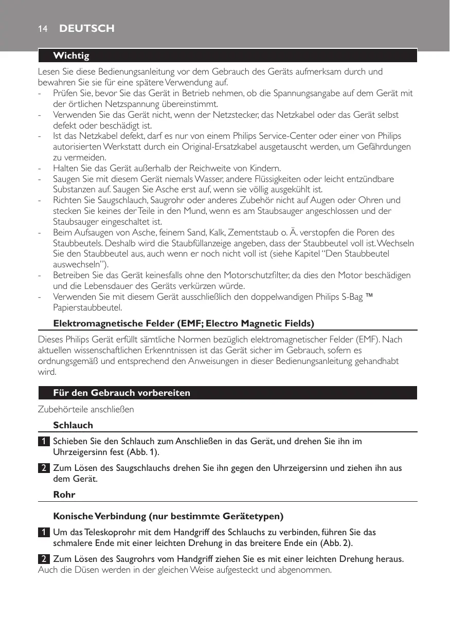 Deutsch Wichtig Lesen Sie diese Bedienungsanleitung vor dem Gebrauch des Geräts aufmerksam durch und bewahren Sie sie für eine spätere Verwendung auf. -- Prüfen Sie, bevor Sie das Gerät in Betrieb nehmen, ob die Spannungsangabe auf dem Gerät mit der örtlichen Netzspannung übereinstimmt. -- Verwenden Sie das Gerät nicht, wenn der Netzstecker, das Netzkabel oder das Gerät selbst defekt oder beschädigt ist. -- Ist das Netzkabel defekt, darf es nur von einem Philips Service-Center oder einer von Philips autorisierten Werkstatt durch ein Original-Ersatzkabel ausgetauscht werden, um Gefährdungen zu vermeiden. -- Halten Sie das Gerät außerhalb der Reichweite von Kindern. -- Saugen Sie mit diesem Gerät niemals Wasser, andere Flüssigkeiten oder leicht entzündbare Substanzen auf. Saugen Sie Asche erst auf, wenn sie völlig ausgekühlt ist. -- Richten Sie Saugschlauch, Saugrohr oder anderes Zubehör nicht auf Augen oder Ohren und stecken Sie keines der Teile in den Mund, wenn es am Staubsauger angeschlossen und der Staubsauger eingeschaltet ist. -- Beim Aufsaugen von Asche, feinem Sand, Kalk, Zementstaub o. Ä. verstopfen die Poren des Staubbeutels. Deshalb wird die Staubfüllanzeige angeben, dass der Staubbeutel voll ist. Wechseln Sie den Staubbeutel aus, auch wenn er noch nicht voll ist (siehe Kapitel “Den Staubbeutel auswechseln”). -- Betreiben Sie das Gerät keinesfalls ohne den Motorschutzfilter, da dies den Motor beschädigen und die Lebensdauer des Geräts verkürzen würde. -- Verwenden Sie mit diesem Gerät ausschließlich den doppelwandigen Philips S-Bag ` Papierstaubbeutel. Elektromagnetische Felder (EMF; Electro Magnetic Fields) Dieses Philips Gerät erfüllt sämtliche Normen bezüglich elektromagnetischer Felder (EMF). Nach aktuellen wissenschaftlichen Erkenntnissen ist das Gerät sicher im Gebrauch, sofern es ordnungsgemäß und entsprechend den Anweisungen in dieser Bedienungsanleitung gehandhabt wird. Für den Gebrauch vorbereiten Zubehörteile anschließen Schlauch 1 Schieben Sie den Schlauch zum Anschließen in das Gerät, und drehen Sie ihn im Uhrzeigersinn fest (Abb. 1). 2 Zum Lösen des Saugschlauchs drehen Sie ihn gegen den Uhrzeigersinn und ziehen ihn aus dem Gerät. Rohr Konische Verbindung (nur bestimmte Gerätetypen) 1 Um das Teleskoprohr mit dem Handgriff des Schlauchs zu verbinden, führen Sie das schmalere Ende mit einer leichten Drehung in das breitere Ende ein (Abb. 2). 2 Zum Lösen des Saugrohrs vom Handgriff ziehen Sie es mit einer leichten Drehung heraus. Auch die Düsen werden in der gleichen Weise aufgesteckt und abgenommen. Deutsch 15 Federtasten-Verbindung (nur bestimmte Gerätetypen) 1 Um das Teleskoprohr mit dem Handgriff zu verbinden, drücken Sie die Federtaste am Handgriff (1) und stecken Sie den Griff in das Rohr (2). Lassen Sie die Federtaste in die Öffnung im Rohr einrasten (Sie hören ein Klicken) (Abb. 3). 2 Zum Lösen des Saugrohrs vom Handgriff drücken Sie die Federtaste und ziehen Sie den Griff aus dem Rohr heraus. Auch die Düsen werden in der gleichen Weise aufgesteckt und abgenommen. Teleskoprohr (nur bestimmte Gerätetypen) 1 Stellen Sie das Saugrohr auf die Länge ein, bei der Sie am bequemsten staubsaugen können (Abb. 4). Düsen Kombi-Düse (nur bestimmte Gerätetypen) Mit der Kombi-Düse können Sie harte und weiche Böden saugen. 1 Stecken Sie die Kombi-Düse auf das Rohr. 2 Drücken Sie zum Saugen von Hartböden den Kippschalter auf der Kombi-Düse mit dem Fuß nach unten, so dass die Bürstenleiste hervortritt. (Abb. 5) 3 Drücken Sie den Kippschalter zum Saugen von Textilböden in die andere Richtung, so dass die Bürstenleiste wieder im Düsengehäuse versenkt wird. (Abb. 6) Reach-&-Clean-Düse (nur bestimmte Gerätetypen) -- Mit der Reach-&-Clean-Düse können Sie harte und weiche Böden saugen. Die Düse lässt sich um 360 Grad drehen und in vier unterschiedlichen Stellungen fixieren, damit Sie große und schwer erreichbare Flächen mühelos saugen können. Bei längs gestellter Düse ist die Saugkraft an der Vorderseite der Düse am stärksten (Abb. 7). -- Um die Düse an den jeweiligen Fußboden anzupassen, stellen Sie einen Fuß auf den markierten Punkt und drehen Sie das Saugrohr, bis die Düse in der gewünschten Position steht (Abb. 8). 1 Befestigen Sie die Reach-&-Clean-Düse am Saugrohr. 2 Mit quer gestellter Düse und ausgefahrener Bürstenleiste können Sie große Hartbodenflächen reinigen. Drehen Sie das Rohr, bis die Bürstenleiste ausgefahren wird und die Düse quer steht (Abb. 9). 3 Mit längs gestellter Düse und ausgefahrener Bürstenleiste können Sie kleine Hartbodenflächen reinigen. Drehen Sie das Saugrohr um 90 Grad gegen den Uhrzeigersinn, bis die Düse längs steht und die Bürstenleiste noch ausgefahren ist (Abb. 10). 4 Mit quer gestellter Düse und versenkter Bürstenleiste können Sie große Flächen mit Textilböden reinigen. Drehen Sie das Rohr wieder um 90 Grad gegen den Uhrzeigersinn, bis die Düse quer steht und die Bürstenleiste im Düsengehäuse versenkt ist (Abb. 11). 5 Mit längs gestellter Düse und versenkter Bürstenleiste können Sie kleine Flächen mit Textilböden reinigen. Drehen Sie das Saugrohr wieder um 90 Grad gegen den Uhrzeigersinn, bis die Düse längs steht und die Bürstenleiste im Düsengehäuse versenkt ist (Abb. 12). Fugendüse, kleine Saugdüse und Bürstendüse (nur bestimmte Gerätetypen) 1 Verbinden Sie die Fugendüse, die kleine Düse oder die Bürstendüse direkt mit dem Handgriff oder dem Saugrohr.