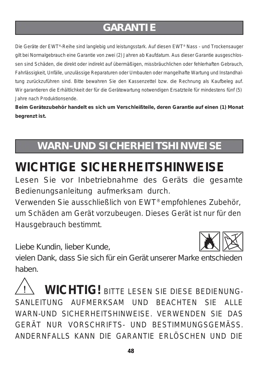 GARANTIE Die Geräte der EWT®-Reihe sind langlebig und leistungsstark. Auf diesen EWT® Nass - und Trockensauger gilt bei Normalgebrauch eine Garantie von zwei (2) Jahren ab Kaufdatum. Aus dieser Garantie ausgeschlossen sind Schäden, die direkt oder indirekt auf übermäßigen, missbräuchlichen oder fehlerhaften Gebrauch, Fahrlässigkeit, Unfälle, unzulässige Reparaturen oder Umbauten oder mangelhafte Wartung und Instandhaltung zurückzuführen sind. Bitte bewahren Sie den Kassenzettel bzw. die Rechnung als Kaufbeleg auf. Wir garantieren die Erhältlichkeit der für die Gerätewartung notwendigen Ersatzteile für mindestens fünf (5) Jahre nach Produktionsende. Beim Gerätezubehör handelt es sich um Verschleißteile, deren Garantie auf einen (1) Monat begrenzt ist. WARN-UND SICHERHEITSHINWEISE WICHTIGE SICHERHEITSHINWEISE Lesen Sie vor Inbetriebnahme des Geräts die gesamte Bedienungsanleitung aufmerksam durch. Verwenden Sie ausschließlich von EWT® empfohlenes Zubehör, um Schäden am Gerät vorzubeugen. Dieses Gerät ist nur für den Hausgebrauch bestimmt. Liebe Kundin, lieber Kunde, vielen Dank, dass Sie sich für ein Gerät unserer Marke entschieden haben. WICHTIG! BITTE LESEN SIE DIESE BEDIENUNGSANLEITUNG AUFMERKSAM UND BEACHTEN SIE ALLE