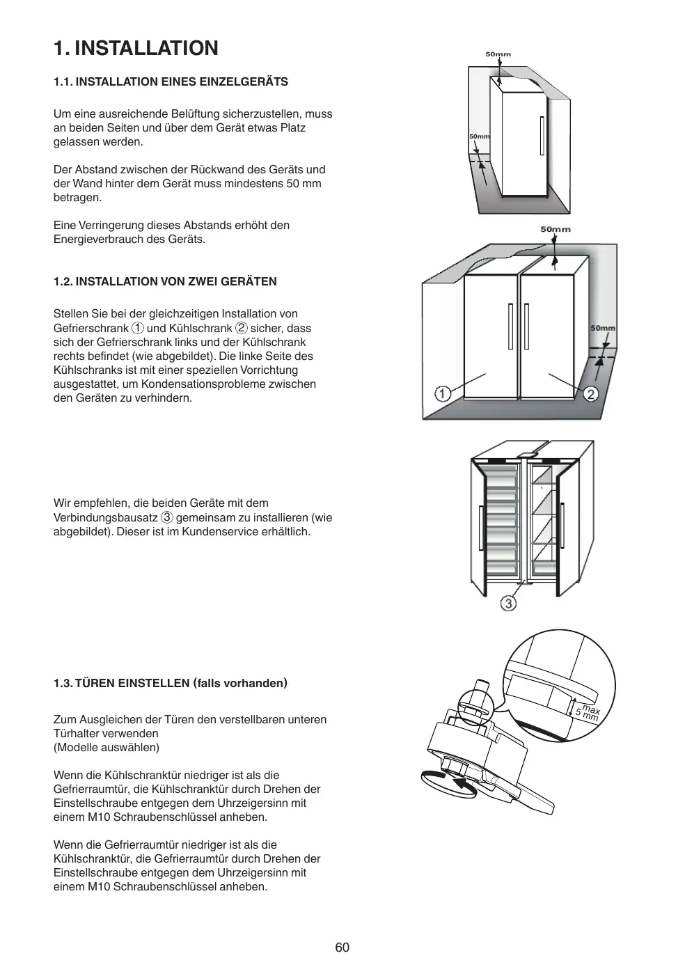 1.2. INSTALLATION DE DEUX APPAREILS Durant l'installation du congélateur 1 et du réfrigérateur 2 , assurez-vous que le congélateur est placé à gauche et le réfrigérateur à droite (comme illustré sur l'image). Sur le côté gauche du réfrigérateur se trouve un dispositif spécial permettant d'éviter les problèmes de condensation entre les appareils.