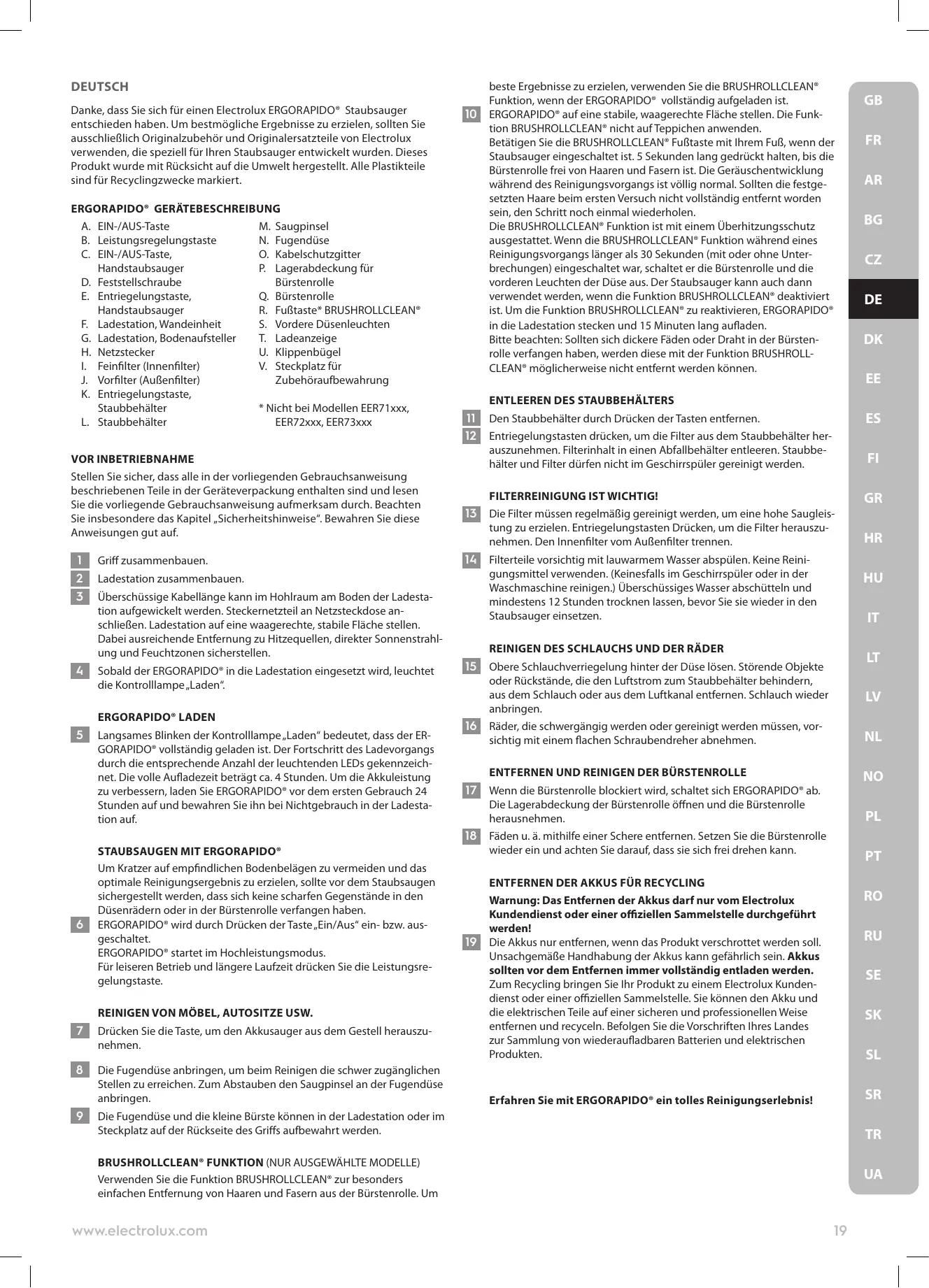 ES FI GR HR HU IT LT LV NL NO PL PT RO RU ERGORAPIDO® darf nur für normales Staubsaugen in Innenräumen und nur im Haushalt und verwendet werden. Staubsauger immer an einem trockenen Ort aufbewahren. Verpackungsmaterial wie Plastikbeutel u. ä. von Kindern fernhalten. Es besteht Erstickungsgefahr. Verwenden Sie den Staubsauger niemals: • In nassen Bereichen. • In der Nähe von brennbaren Gasen etc. • Wenn das Gerät sichtbare Schäden aufweist. • Für Flüssigkeiten oder scharfkantige und spitze Gegenstände. • Für heiße oder kalte Asche, brennende Zigarettenkippen etc. • Für feinen Staub (z. B. von Gips, Beton, Mehl, heißer oder kalter Asche). Vorsicht: • Den Staubsauger niemals in direktem Sonnenlicht stehen lassen. • Staubsauger vor starker Hitze schützen. • Akkuzellen niemals zerlegen, kurzschließen oder gegen leitende Flächen halten. • Staubsauger niemals ohne Filter benutzen. • Bürstenrolle nicht berühren, solange sie sich dreht und solange der Staubsauger eingeschaltet ist. • Achten Sie beim Reinigen des Inneren der Bodendüse auf Ihre Finger. Die Metallklinge der BRUSHROLLCLEAN® Funktion ist scharf und kann zu Verletzungen führen.