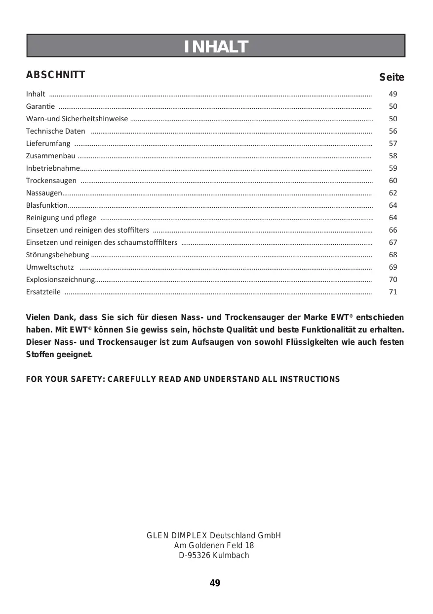 Vielen Dank, dass Sie sich für diesen Nass- und Trockensauger der Marke EWT® entschieden haben. Mit EWT® können Sie gewiss sein, höchste Qualität und beste Funktionalität zu erhalten. Dieser Nass- und Trockensauger ist zum Aufsaugen von sowohl Flüssigkeiten wie auch festen Stoffen geeignet. FOR YOUR SAFETY: CAREFULLY READ AND UNDERSTAND ALL INSTRUCTIONS GLEN DIMPLEX Deutschland GmbH Am Goldenen Feld 18 D-95326 Kulmbach