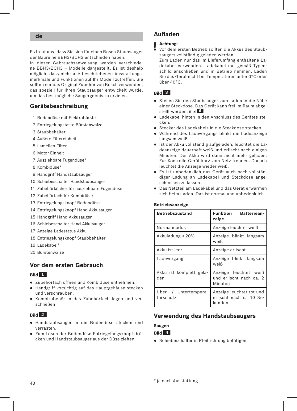 Es freut uns, dass Sie sich für einen Bosch Staubsauger der Baureihe BBH3/BCH3 entschieden haben. In dieser Gebrauchsanweisung werden verschiedene BBH3/BCH3 – Modelle dargestellt. Es ist deshalb möglich, dass nicht alle beschriebenen Ausstattungsmerkmale und Funktionen auf Ihr Modell zutreffen. Sie sollten nur das Original Zubehör von Bosch verwenden, das speziell für Ihren Staubsauger entwickelt wurde, um das bestmögliche Saugergebnis zu erzielen. Gerätebeschreibung 1 Bodendüse mit Elektrobürste 2 Entriegelungstaste Bürstenwalze 3 Staubbehälter 4 Äußere Filtereinheit 5 Lamellen-Filter Aufladen