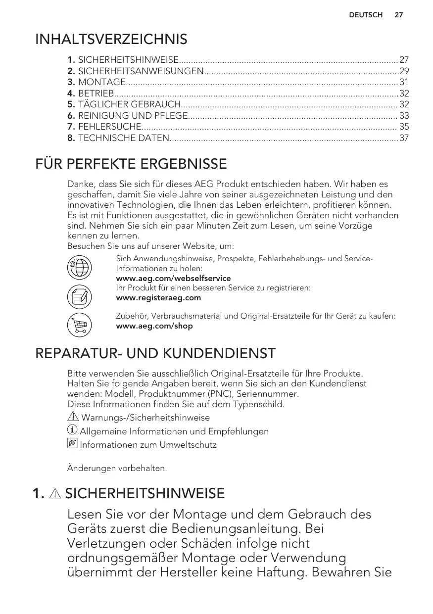 Danke, dass Sie sich für dieses AEG Produkt entschieden haben. Wir haben es geschaffen, damit Sie viele Jahre von seiner ausgezeichneten Leistung und den innovativen Technologien, die Ihnen das Leben erleichtern, profitieren können. Es ist mit Funktionen ausgestattet, die in gewöhnlichen Geräten nicht vorhanden sind. Nehmen Sie sich ein paar Minuten Zeit zum Lesen, um seine Vorzüge kennen zu lernen. Besuchen Sie uns auf unserer Website, um: Sich Anwendungshinweise, Prospekte, Fehlerbehebungs- und ServiceInformationen zu holen: www.aeg.com/webselfservice Ihr Produkt für einen besseren Service zu registrieren: www.registeraeg.com Zubehör, Verbrauchsmaterial und Original-Ersatzteile für Ihr Gerät zu kaufen: www.aeg.com/shop