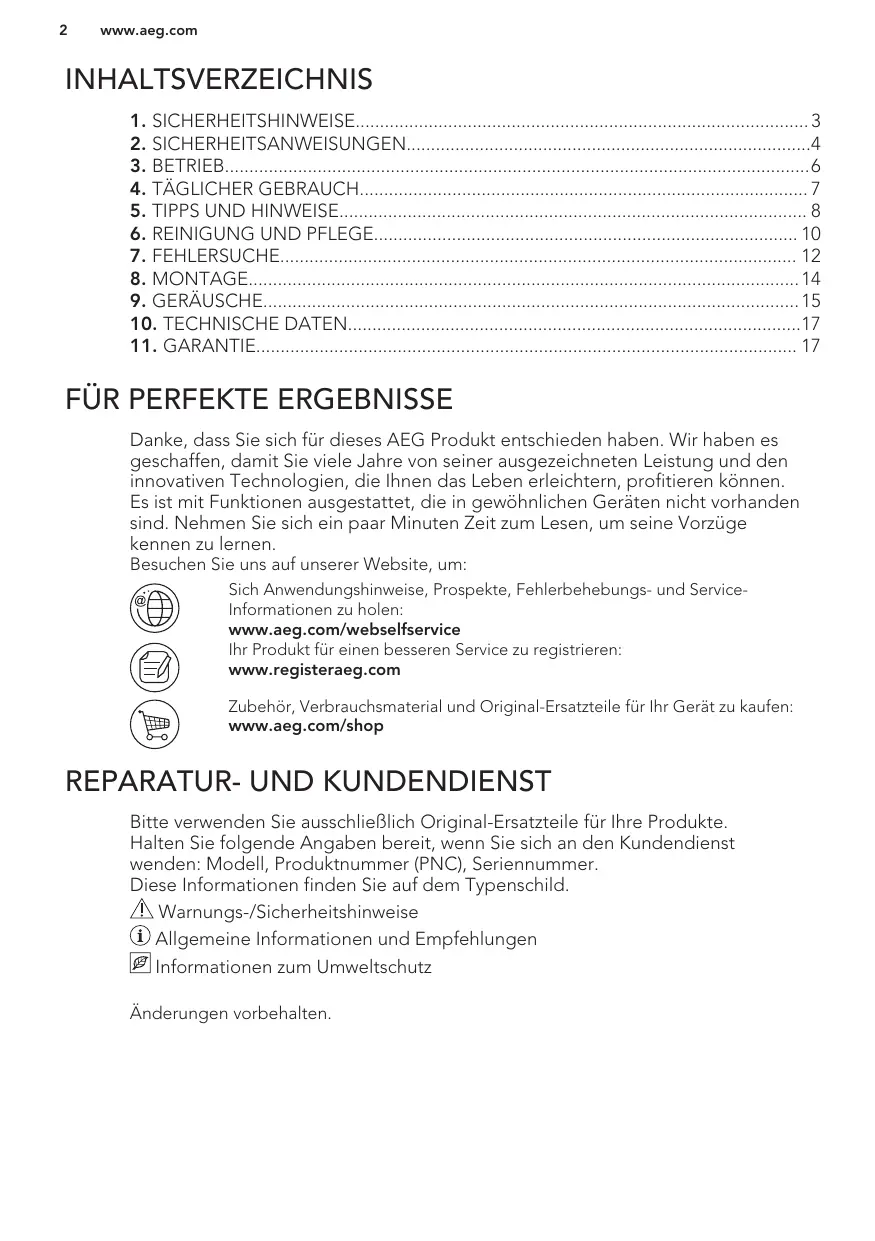 Danke, dass Sie sich für dieses AEG Produkt entschieden haben. Wir haben es geschaffen, damit Sie viele Jahre von seiner ausgezeichneten Leistung und den innovativen Technologien, die Ihnen das Leben erleichtern, profitieren können. Es ist mit Funktionen ausgestattet, die in gewöhnlichen Geräten nicht vorhanden sind. Nehmen Sie sich ein paar Minuten Zeit zum Lesen, um seine Vorzüge kennen zu lernen. Besuchen Sie uns auf unserer Website, um: Sich Anwendungshinweise, Prospekte, Fehlerbehebungs- und ServiceInformationen zu holen: www.aeg.com/webselfservice Ihr Produkt für einen besseren Service zu registrieren: www.registeraeg.com Zubehör, Verbrauchsmaterial und Original-Ersatzteile für Ihr Gerät zu kaufen: www.aeg.com/shop