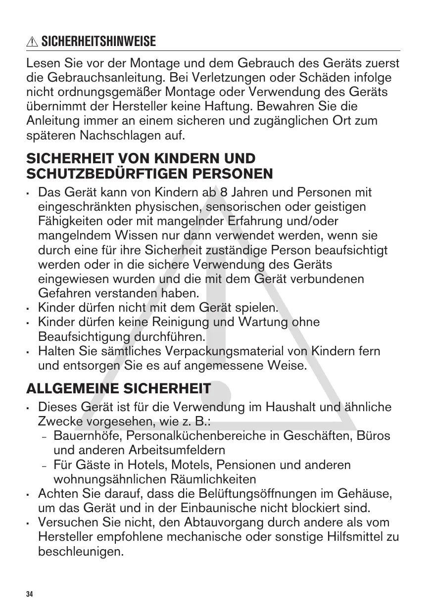Dieses Gerät ist für die Verwendung im Haushalt und ähnliche Zwecke vorgesehen, wie z. B.: – Bauernhöfe, Personalküchenbereiche in Geschäften, Büros und anderen Arbeitsumfeldern – Für Gäste in Hotels, Motels, Pensionen und anderen wohnungsähnlichen Räumlichkeiten Achten Sie darauf, dass die Belüftungsöffnungen im Gehäuse, um das Gerät und in der Einbaunische nicht blockiert sind. Versuchen Sie nicht, den Abtauvorgang durch andere als vom Hersteller empfohlene mechanische oder sonstige Hilfsmittel zu beschleunigen.