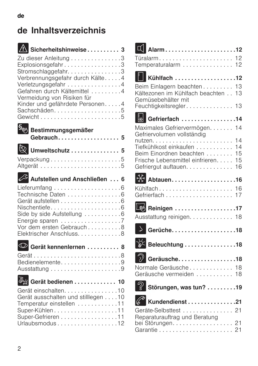 Lieferumfang . . . . . . . . . . . Technische Daten . . . . . . . Gerät aufstellen . . . . . . . . . Nischentiefe . . . . . . . . . . . . Side by side Aufstellung . . Energie sparen . . . . . . . . . Vor dem ersten Gebrauch . Elektrischer Anschluss. . . .