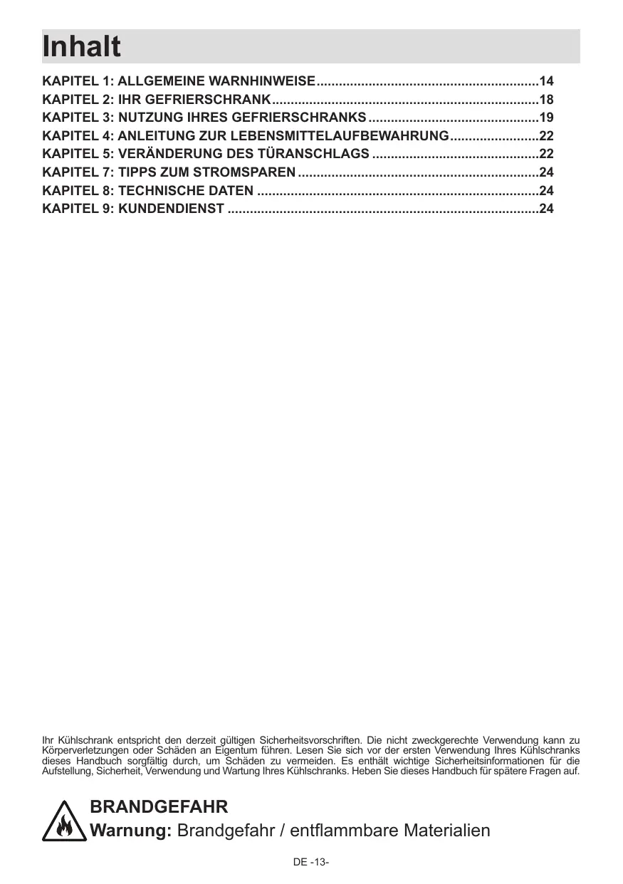 • • Évitez de tirer, de tordre ou d'endommager le cordon. Si votre câble d'alimentation est endommagé, faites-le remplacer par un service après-vente agréé pour éviter tout danger. Le présent appareil a été conçu pour être utilisé par des adultes. En conséquence, évitez de laisser les enfants s'en servir comme jouet, car ils pourraient se blesser. Ne pas casser ou gratter la glace avec des objets pointus comme un couteau ou des objets similaires. Évitez de brancher ou de débrancher l'appareil avec des mains mouillées au risque d'être victime d'une électrocution ! Évitez de mettre des bouteilles dans le congélateur. Les bouteilles ou les canettes pourraient exploser. Pour votre sécurité, ne placez pas des matières explosives ou inflammables dans votre congélateur. Au moment de sortir la glace fabriquée dans le congélateur, évitez de la toucher. Si vous le faites, la glace pourrait vous causer des brûlures. Evitez de toucher aux denrées congelées avec les mains nues ! Évitez de consommer les glaçons et les glaces directement après les avoir sortis du congélateur ! Ne jamais recongeler des denrées décongelées. Cela peut provoquer des problèmes de santé comme une intoxication alimentaire. Fixez les accessoires dans le congélateur pendant le transport pour éviter de les endommager.