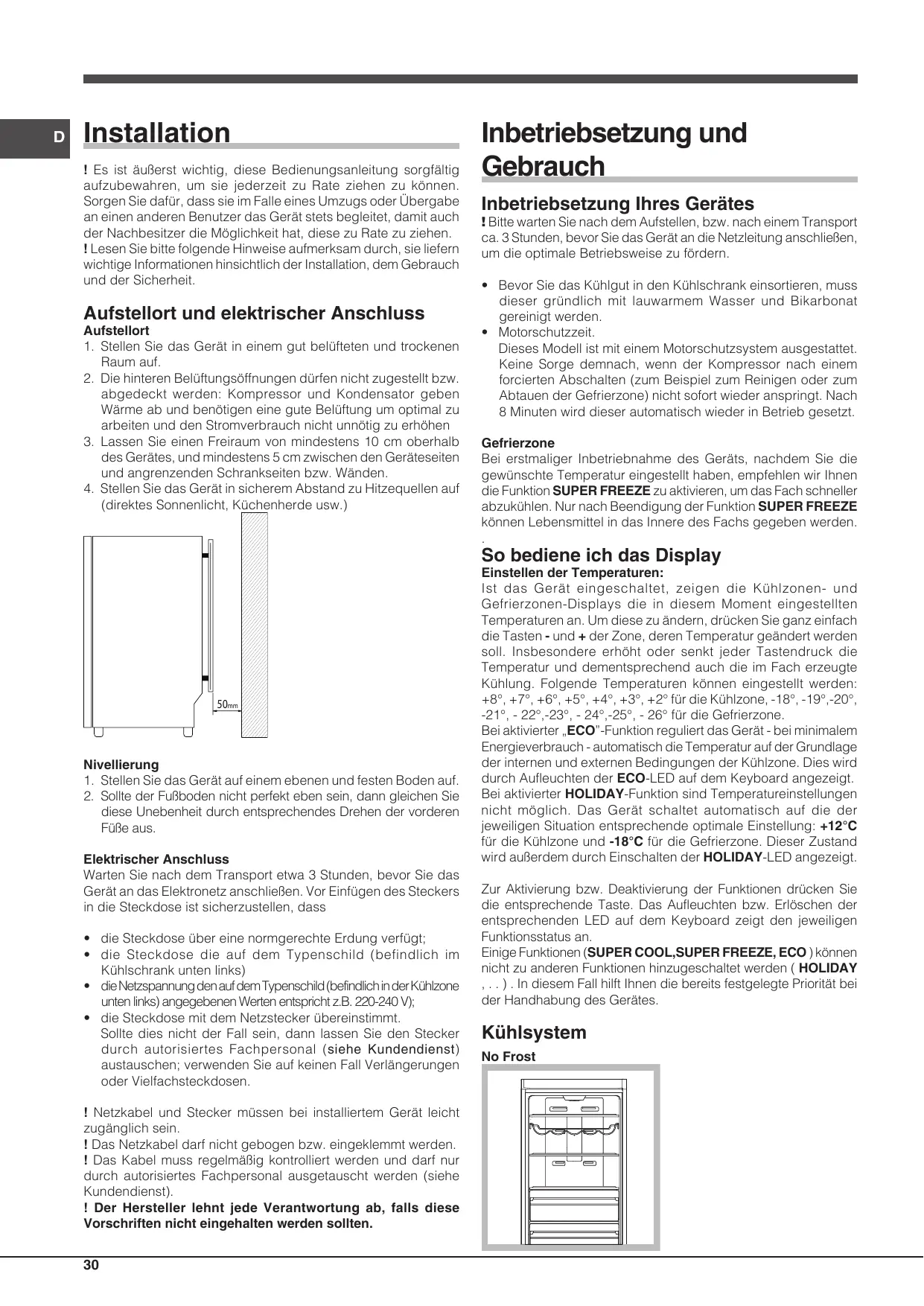 D Installation ! Es ist äußerst wichtig, diese Bedienungsanleitung sorgfältig aufzubewahren, um sie jederzeit zu Rate ziehen zu können. Sorgen Sie dafür, dass sie im Falle eines Umzugs oder Übergabe an einen anderen Benutzer das Gerät stets begleitet, damit auch der Nachbesitzer die Möglichkeit hat, diese zu Rate zu ziehen. ! Lesen Sie bitte folgende Hinweise aufmerksam durch, sie liefern wichtige Informationen hinsichtlich der Installation, dem Gebrauch und der Sicherheit.