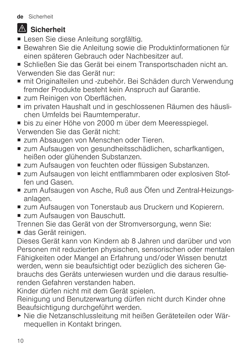 Sicherheit ¡ Lesen Sie diese Anleitung sorgfältig. ¡ Bewahren Sie die Anleitung sowie die Produktinformationen für einen späteren Gebrauch oder Nachbesitzer auf. ¡ Schließen Sie das Gerät bei einem Transportschaden nicht an. Verwenden Sie das Gerät nur: ¡ mit Originalteilen und -zubehör. Bei Schäden durch Verwendung fremder Produkte besteht kein Anspruch auf Garantie. ¡ zum Reinigen von Oberflächen. ¡ im privaten Haushalt und in geschlossenen Räumen des häuslichen Umfelds bei Raumtemperatur. ¡ bis zu einer Höhe von 2000 m über dem Meeresspiegel. Verwenden Sie das Gerät nicht: ¡ zum Absaugen von Menschen oder Tieren. ¡ zum Aufsaugen von gesundheitsschädlichen, scharfkantigen, heißen oder glühenden Substanzen. ¡ zum Aufsaugen von feuchten oder flüssigen Substanzen. ¡ zum Aufsaugen von leicht entflammbaren oder explosiven Stoffen und Gasen. ¡ zum Aufsaugen von Asche, Ruß aus Öfen und Zentral-Heizungsanlagen. ¡ zum Aufsaugen von Tonerstaub aus Druckern und Kopierern. ¡ zum Aufsaugen von Bauschutt. Trennen Sie das Gerät von der Stromversorgung, wenn Sie: ¡ das Gerät reinigen. Dieses Gerät kann von Kindern ab 8 Jahren und darüber und von Personen mit reduzierten physischen, sensorischen oder mentalen Fähigkeiten oder Mangel an Erfahrung und/oder Wissen benutzt werden, wenn sie beaufsichtigt oder bezüglich des sicheren Gebrauchs des Geräts unterwiesen wurden und die daraus resultierenden Gefahren verstanden haben. Kinder dürfen nicht mit dem Gerät spielen. Reinigung und Benutzerwartung dürfen nicht durch Kinder ohne Beaufsichtigung durchgeführt werden. ▶ Nie die Netzanschlussleitung mit heißen Geräteteilen oder Wärmequellen in Kontakt bringen. 10