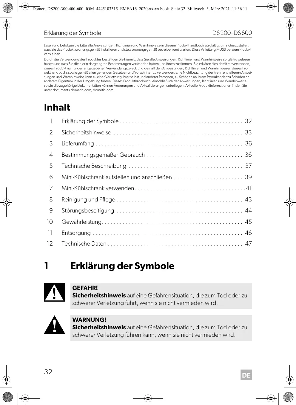 Dieses Handbuch enthält Informationen, die für die ordnungsgemäße Installation und den ordnungsgemäßen Betrieb des Minikühlschranks erforderlich sind. Installationsfehler und/oder ein nicht ordnungsgemäßer Betrieb oder nicht ordnungsgemäße Wartung haben eine unzureichende Leistung und u. U. einen Ausfall des Geräts zur Folge. Der Hersteller übernimmt keine Haftung für Verletzungen oder Schäden am Produkt, die durch Folgendes entstehen: • Unsachgemäße Montage oder falscher Anschluss, einschließlich Überspannung • Unsachgemäße Wartung oder Verwendung von anderen als den vom Hersteller gelieferten Original-Ersatzteilen • Veränderungen am Produkt ohne ausdrückliche Genehmigung des Herstellers • Verwendung für andere als die in der Anleitung beschriebenen Zwecke Dometic behält sich das Recht vor, das Erscheinungsbild des Produkts und dessen technische Daten zu ändern.