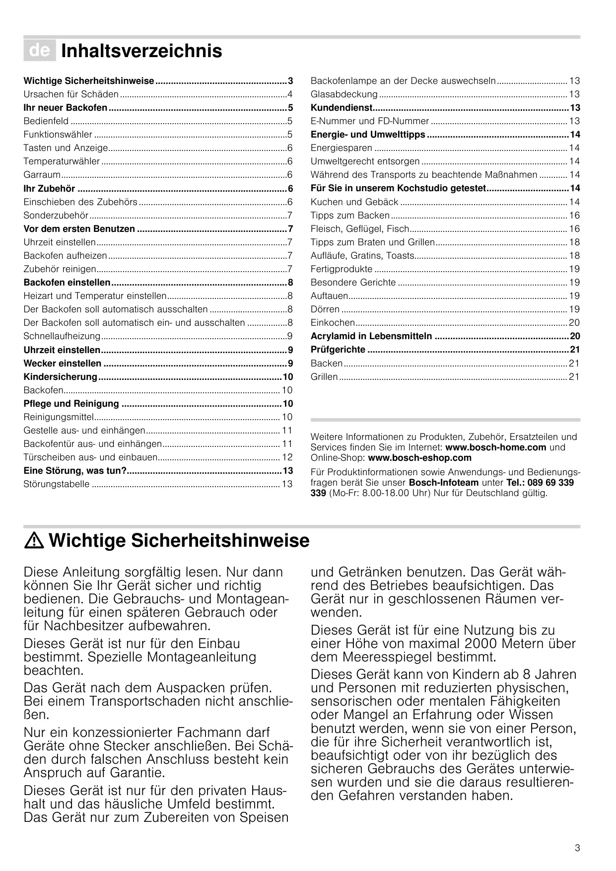 - Grillen Produktinfo Weitere Informationen zu Produkten, Zubehör, Ersatzteilen und Services finden Sie im Internet: www.bosch-home.com und Online-Shop: www.bosch-eshop.com Für Produktinformationen sowie Anwendungs- und Bedienungsfragen berät Sie unser Bosch-Infoteam unter Tel.: 089 69 339 339 (Mo-Fr: 8.00-18.00 Uhr) Nur für Deutschland gültig. : Wichtige Sicherheitshinweise Diese Anleitung sorgfältig lesen. Nur dann können Sie Ihr Gerät sicher und richtig bedienen. Die Gebrauchs- und Montageanleitung für einen späteren Gebrauch oder für Nachbesitzer aufbewahren. Dieses Gerät ist nur für den Einbau bestimmt. Spezielle Montageanleitung beachten. Das Gerät nach dem Auspacken prüfen. Bei einem Transportschaden nicht anschließen. Nur ein konzessionierter Fachmann darf Geräte ohne Stecker anschließen. Bei Schäden durch falschen Anschluss besteht kein Anspruch auf Garantie. Dieses Gerät ist nur für den privaten Haushalt und das häusliche Umfeld bestimmt. Das Gerät nur zum Zubereiten von Speisen und Getränken benutzen. Das Gerät während des Betriebes beaufsichtigen. Das Gerät nur in geschlossenen Räumen verwenden. Dieses Gerät ist für eine Nutzung bis zu einer Höhe von maximal 2000 Metern über dem Meeresspiegel bestimmt. Dieses Gerät kann von Kindern ab 8 Jahren und Personen mit reduzierten physischen, sensorischen oder mentalen Fähigkeiten oder Mangel an Erfahrung oder Wissen benutzt werden, wenn sie von einer Person, die für ihre Sicherheit verantwortlich ist, beaufsichtigt oder von ihr bezüglich des sicheren Gebrauchs des Gerätes unterwiesen wurden und sie die daraus resultierenden Gefahren verstanden haben. p. 21