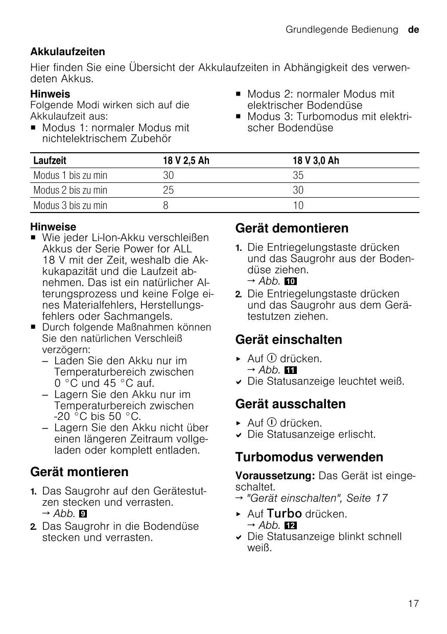¡ Mode 2 : mode normal avec une Les modes suivants affectent brosse électrique pour sols l'autonomie de la batterie : ¡ Mode 3 : mode turbo avec une ¡ Mode 1 : mode normal avec un brosse électrique pour sols accessoire non électrique Durée de marche Mode 1 jusqu'à min Mode 2 jusqu'à min Mode 3 jusqu'à min – Ne stockez pas la batterie pendant une période de temps prolongée alors qu'elle est entièrement chargée ou complètement déchargée.