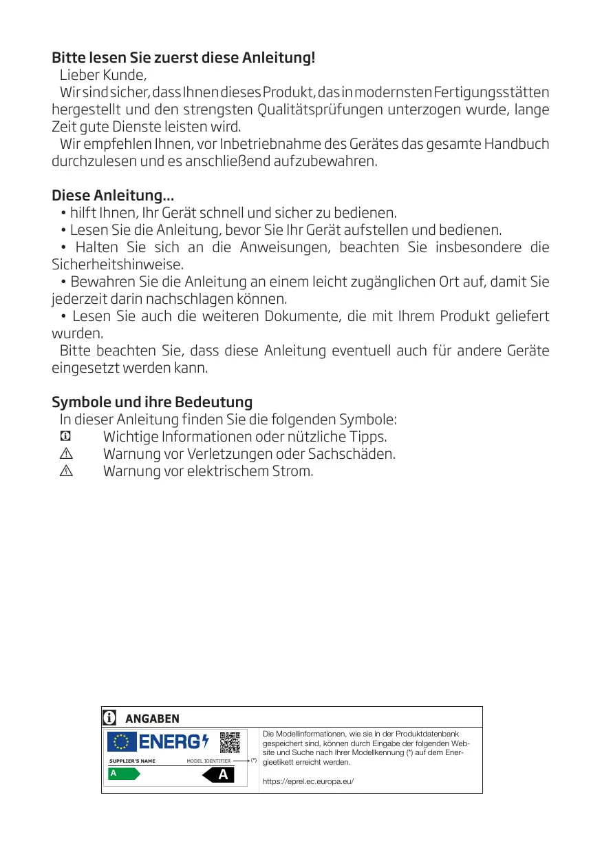 Bitte lesen Sie zuerst diese Anleitung! Lieber Kunde, Wir sind sicher, dass Ihnen dieses Produkt, das in modernsten Fertigungsstätten hergestellt und den strengsten Qualitätsprüfungen unterzogen wurde, lange Zeit gute Dienste leisten wird. Wir empfehlen Ihnen, vor Inbetriebnahme des Gerätes das gesamte Handbuch durchzulesen und es anschließend aufzubewahren. Diese Anleitung... • hilft Ihnen, Ihr Gerät schnell und sicher zu bedienen. • Lesen Sie die Anleitung, bevor Sie Ihr Gerät aufstellen und bedienen. • Halten Sie sich an die Anweisungen, beachten Sie insbesondere die Sicherheitshinweise. • Bewahren Sie die Anleitung an einem leicht zugänglichen Ort auf, damit Sie jederzeit darin nachschlagen können. • Lesen Sie auch die weiteren Dokumente, die mit Ihrem Produkt geliefert wurden. Bitte beachten Sie, dass diese Anleitung eventuell auch für andere Geräte eingesetzt werden kann. Symbole und ihre Bedeutung In dieser Anleitung finden Sie die folgenden Symbole: C Wichtige Informationen oder nützliche Tipps. A Warnung vor Verletzungen oder Sachschäden. B Warnung vor elektrischem Strom.