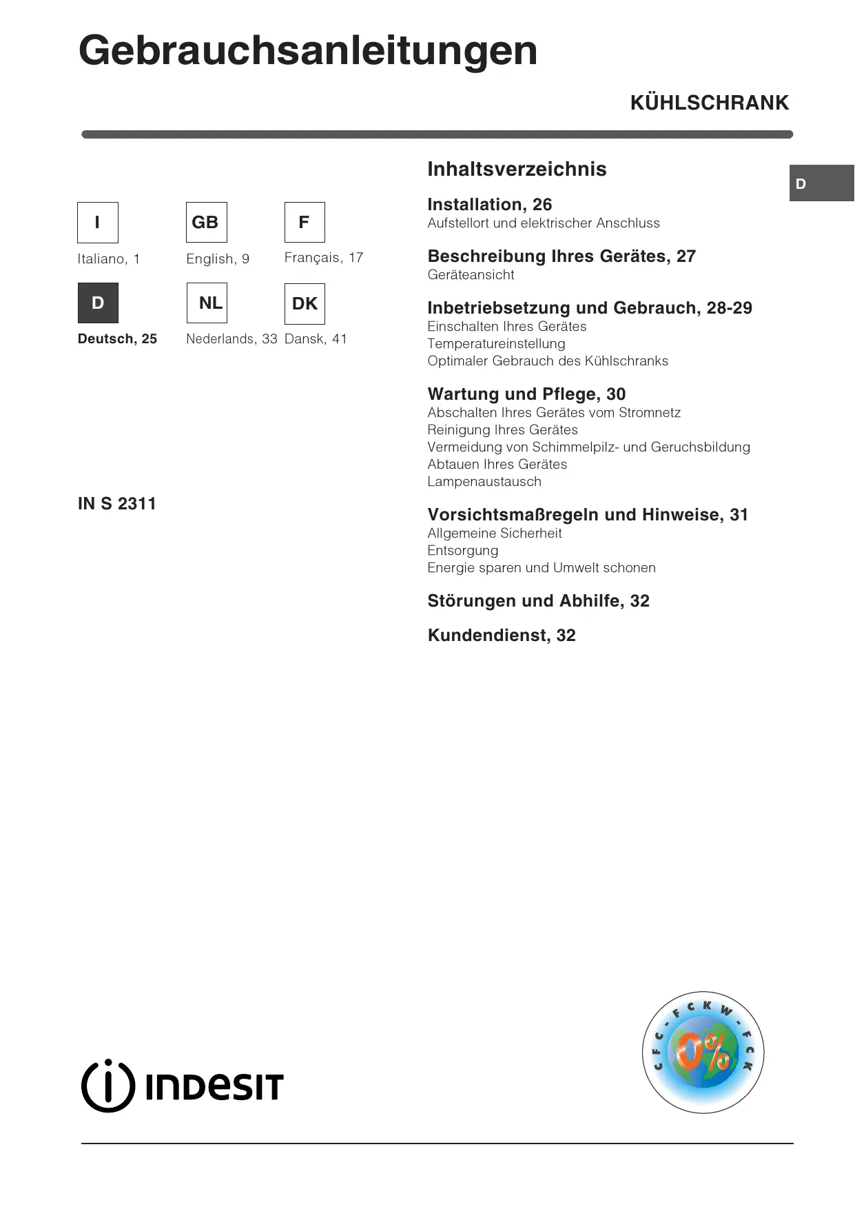 Laden Sie die Anleitung für Ihr Kühlschrank kostenlos im PDF-Format! Finden Sie Ihr Handbuch IN S 2312 F077264 - INDESIT und nehmen Sie Ihr elektronisches Gerät wieder in die Hand. Auf dieser Seite sind alle Dokumente veröffentlicht, die für die Verwendung Ihres Geräts notwendig sind. IN S 2312 F077264 von der Marke INDESIT.