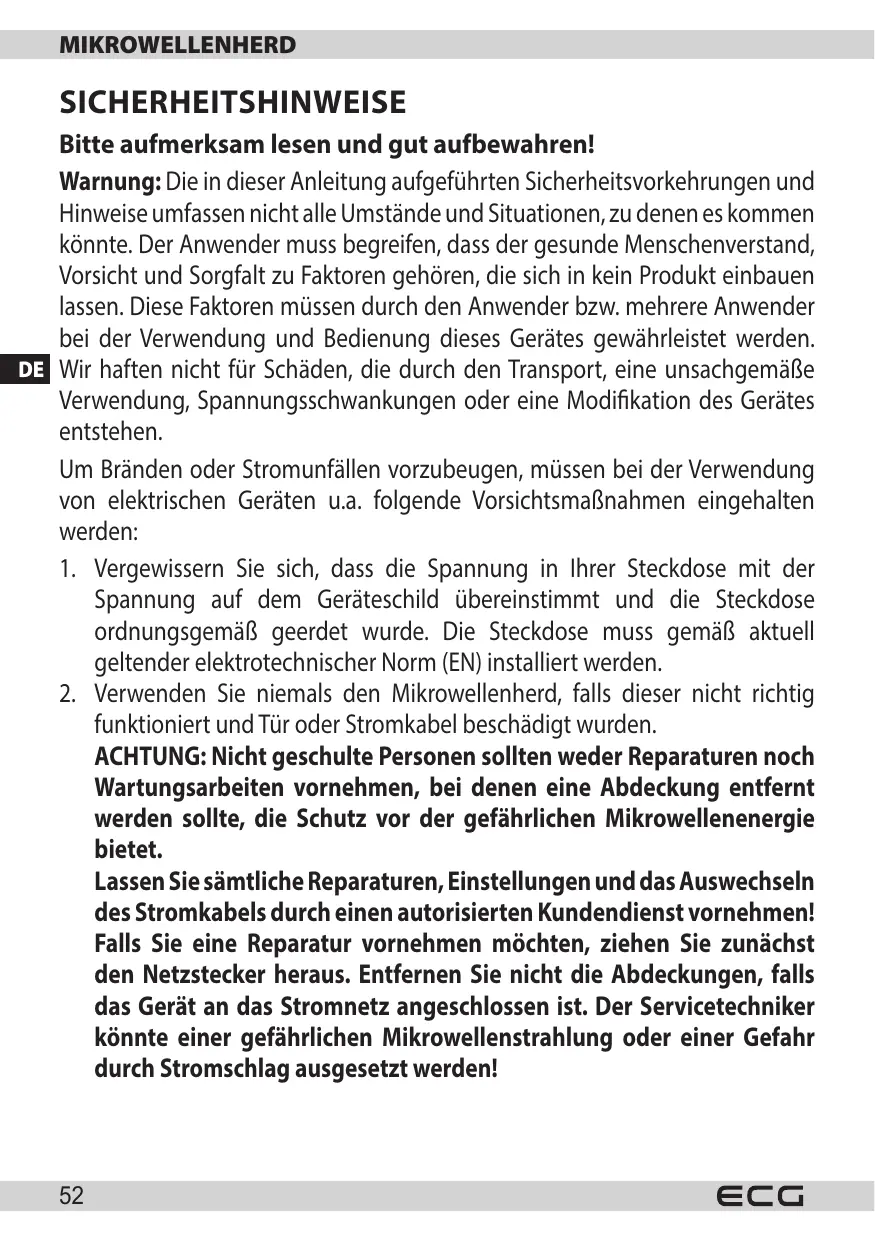 - Verwenden Sie den Mikrowellenherd gemäß den in dieser Anleitung aufgeführten Hinweisen. Diese Mikrowellenherd ist ausschließlich für den Haushaltsgebrauch bestimmt. Der Hersteller haftet nicht für Schäden, die durch eine unsachgemäß Verwendung deses Gerätes entstanden sind.