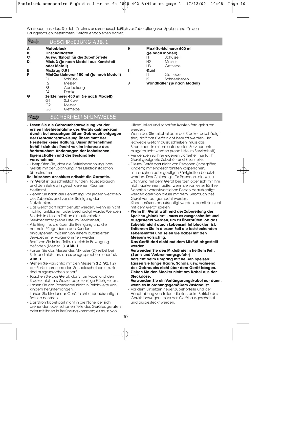 Page 9 Faciclick accessoire F gb d e i tr ar fa 0828 402-A:Mise en page 1 17/12/09 10:08 Wir freuen uns, dass Sie sich für eines unserer ausschließlich zur Zubereitung von Speisen und für den Hausgebrauch bestimmten Geräte entschieden haben. BESCHREIBUNG ABB. 1