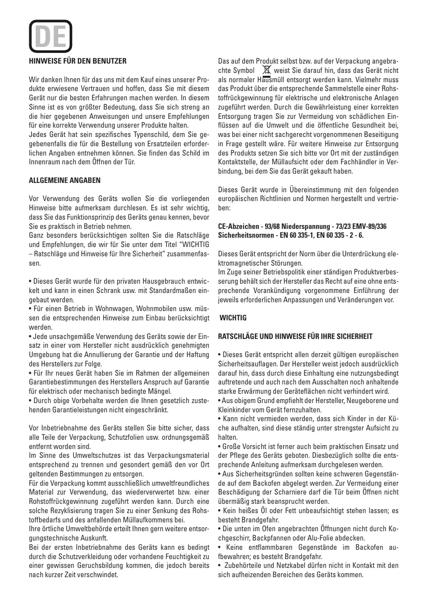 - Durch obige Vorbehalte werden die Ihnen gesetzlich zustehenden Garantieleistungen nicht eingeschränkt. Vor Inbetriebnahme des Geräts stellen Sie bitte sicher, dass alle Teile der Verpackung, Schutzfolien usw. ordnungsgemäß entfernt worden sind. Im Sinne des Umweltschutzes ist das Verpackungsmaterial entsprechend zu trennen und gesondert gemäß den vor Ort geltenden Bestimmungen zu entsorgen. Für die Verpackung kommt ausschließlich umweltfreundliches Material zur Verwendung, das wiederverwertet bzw. einer Rohstoffrückgewinnung zugeführt werden kann. Durch eine solche Rezyklisierung tragen Sie zu einer Senkung des Rohstoffbedarfs und des anfallenden Müllaufkommens bei. Ihre örtliche Umweltbehörde erteilt Ihnen gern weitere entsorgungstechnische Auskunft. Bei der ersten Inbetriebnahme des Geräts kann es bedingt durch die Schutzverkleidung oder vorhandene Feuchtigkeit zu einer gewissen Geruchsbildung kommen, die jedoch bereits nach kurzer Zeit verschwindet. Das auf dem Produkt selbst bzw. auf der Verpackung angebrachte Symbol weist Sie darauf hin, dass das Gerät nicht als normaler Hausmüll entsorgt werden kann. Vielmehr muss das Produkt über die entsprechende Sammelstelle einer Rohstoffrückgewinnung für elektrische und elektronische Anlagen zugeführt werden. Durch die Gewährleistung einer korrekten Entsorgung tragen Sie zur Vermeidung von schädlichen Einflüssen auf die Umwelt und die öffentliche Gesundheit bei, was bei einer nicht sachgerecht vorgenommenen Beseitigung in Frage gestellt wäre. Für weitere Hinweise zur Entsorgung des Produkts setzen Sie sich bitte vor Ort mit der zuständigen Kontaktstelle, der Müllaufsicht oder dem Fachhändler in Verbindung, bei dem Sie das Gerät gekauft haben. Dieses Gerät wurde in Übereinstimmung mit den folgenden europäischen Richtlinien und Normen hergestellt und vertrieben: CE-Abzeichen - 93/68 Niederspannung - 73/23 EMV-89/336 Sicherheitsnormen - EN 60 335-1, EN 60 335 - 2 - 6. Dieses Gerät entspricht der Norm über die Unterdrückung elektromagnetischer Störungen. Im Zuge seiner Betriebspolitik einer ständigen Produktverbesserung behält sich der Hersteller das Recht auf eine ohne entsprechende Vorankündigung vorgenommene Einführung der jeweils erforderlichen Anpassungen und Veränderungen vor. WICHTIG RATSCHLÄGE UND HINWEISE FÜR IHRE SICHERHEIT