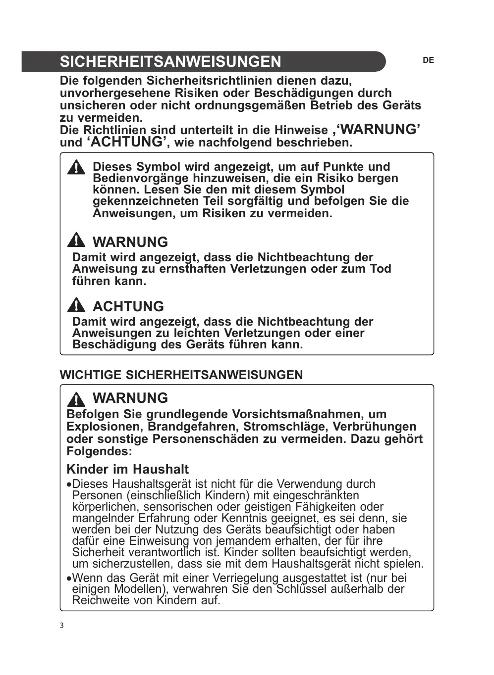 •Dieses Haushaltsgerät ist nicht für die Verwendung durch Personen (einschließlich Kindern) mit eingeschränkten körperlichen, sensorischen oder geistigen Fähigkeiten oder mangelnder Erfahrung oder Kenntnis geeignet, es sei denn, sie werden bei der Nutzung des Geräts beaufsichtigt oder haben dafür eine Einweisung von jemandem erhalten, der für ihre Sicherheit verantwortlich ist. Kinder sollten beaufsichtigt werden, um sicherzustellen, dass sie mit dem Haushaltsgerät nicht spielen. •Wenn das Gerät mit einer Verriegelung ausgestattet ist (nur bei einigen Modellen), verwahren Sie den Schlüssel außerhalb der Reichweite von Kindern auf. 3