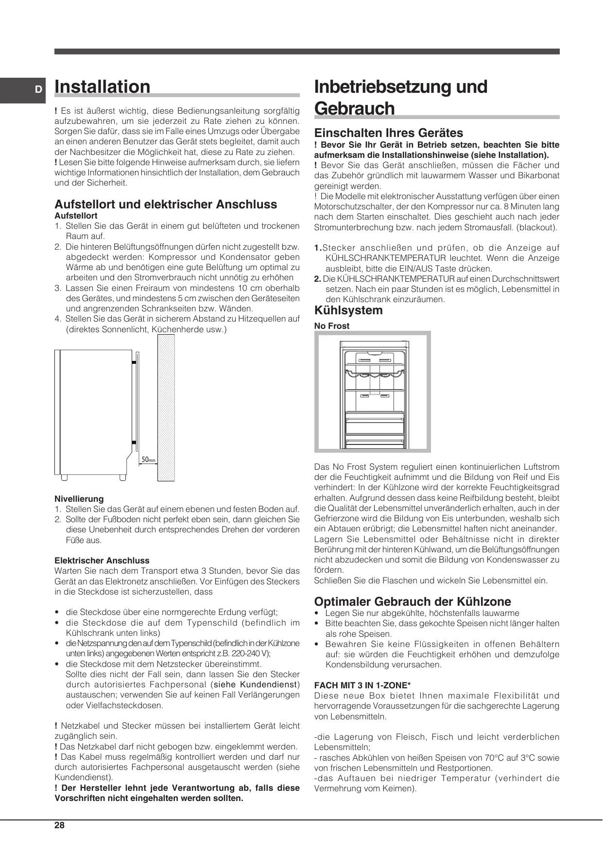 D Installation ! Es ist äußerst wichtig, diese Bedienungsanleitung sorgfältig aufzubewahren, um sie jederzeit zu Rate ziehen zu können. Sorgen Sie dafür, dass sie im Falle eines Umzugs oder Übergabe an einen anderen Benutzer das Gerät stets begleitet, damit auch der Nachbesitzer die Möglichkeit hat, diese zu Rate zu ziehen. ! Lesen Sie bitte folgende Hinweise aufmerksam durch, sie liefern wichtige Informationen hinsichtlich der Installation, dem Gebrauch und der Sicherheit.