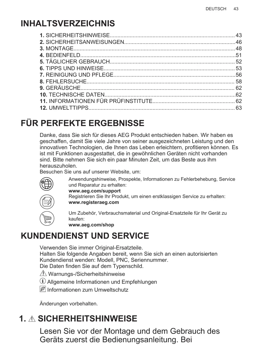 Danke, dass Sie sich für dieses AEG Produkt entschieden haben. Wir haben es geschaffen, damit Sie viele Jahre von seiner ausgezeichneten Leistung und den innovativen Technologien, die Ihnen das Leben erleichtern, profitieren können. Es ist mit Funktionen ausgestattet, die in gewöhnlichen Geräten nicht vorhanden sind. Bitte nehmen Sie sich ein paar Minuten Zeit, um das Beste aus ihm herauszuholen. Besuchen Sie uns auf unserer Website, um: Anwendungshinweise, Prospekte, Informationen zu Fehlerbehebung, Service und Reparatur zu erhalten: www.aeg.com/support Registrieren Sie Ihr Produkt, um einen erstklassigen Service zu erhalten: www.registeraeg.com Um Zubehör, Verbrauchsmaterial und Original-Ersatzteile für Ihr Gerät zu kaufen: www.aeg.com/shop