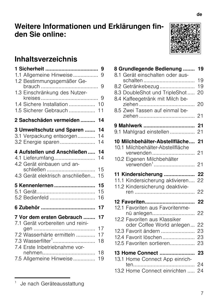 9 Mahlwerk 21 9.1 Mahlgrad einstellen 21 10 Milchbehälter-Abstellfläche.... 21 10.1 Milchbehälter-Abstellfläche verwenden 21 10.2 Eigenen Milchbehälter verwenden1 21 11 Kindersicherung 22 11.1 Kindersicherung aktivieren.... 22 11.2 Kindersicherung deaktivieren 22 12 Favoriten 12.1 Favoriten aus Favoritenmenü anlegen 12.2 Favoriten aus Klassiker oder Coffee World anlegen ... 12.3 Favorit ändern 12.4 Favorit löschen 12.5 Favoriten sortieren