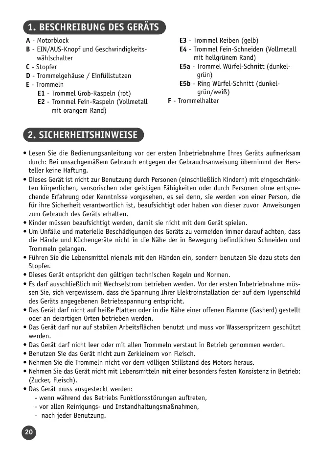 • Il convient de surveiller les enfants pour s’assurer qu’ils ne jouent pas avec l’appareil. • Pour éviter les accidents et les dégâts matériels de l’appareil, toujours garder les mains et les ustensiles de cuisine à l’écart des lames et des cônes en mouvement. • Ne jamais introduire les aliments avec les mains, toujours utiliser le poussoir. • Cet appareil est conforme aux règles techniques et aux normes en vigueur. • Il est conçu pour fonctionner uniquement en courant alternatif. Nous vous demandons avant la première utilisation de vérifier que la tension du réseau correspond bien à celle indiquée sur la plaque signalétique de l’appareil. • Ne pas poser, ni utiliser cet appareil sur une plaque chaude ou à proximité d’une flamme (cuisinière à gaz). • N’utiliser le produit que sur un plan de travail stable à l’abri des projections d’eau. • Ne pas faire fonctionner l’appareil à vide ainsi qu’avec tous les cônes rangés. • Ne pas hacher de viande. • Ne jamais retirer les cônes avant l’arrêt complet du moteur. • Ne pas utiliser le produit pour des aliments trop consistants : (sucre, viande). • L’appareil doit être débranché : - s’il y a une anomalie pendant le fonctionnement, - avant chaque nettoyage ou entretien, - après chaque utilisation. • Ne jamais débrancher l’appareil en tirant sur le cordon. • N’utiliser un prolongateur qu’après avoir vérifié que celui-ci est en parfait état. • Un appareil électroménager ne doit pas être utilisé : - s’il est tombé par terre, - si les cônes sont détériorés ou incomplets. 6