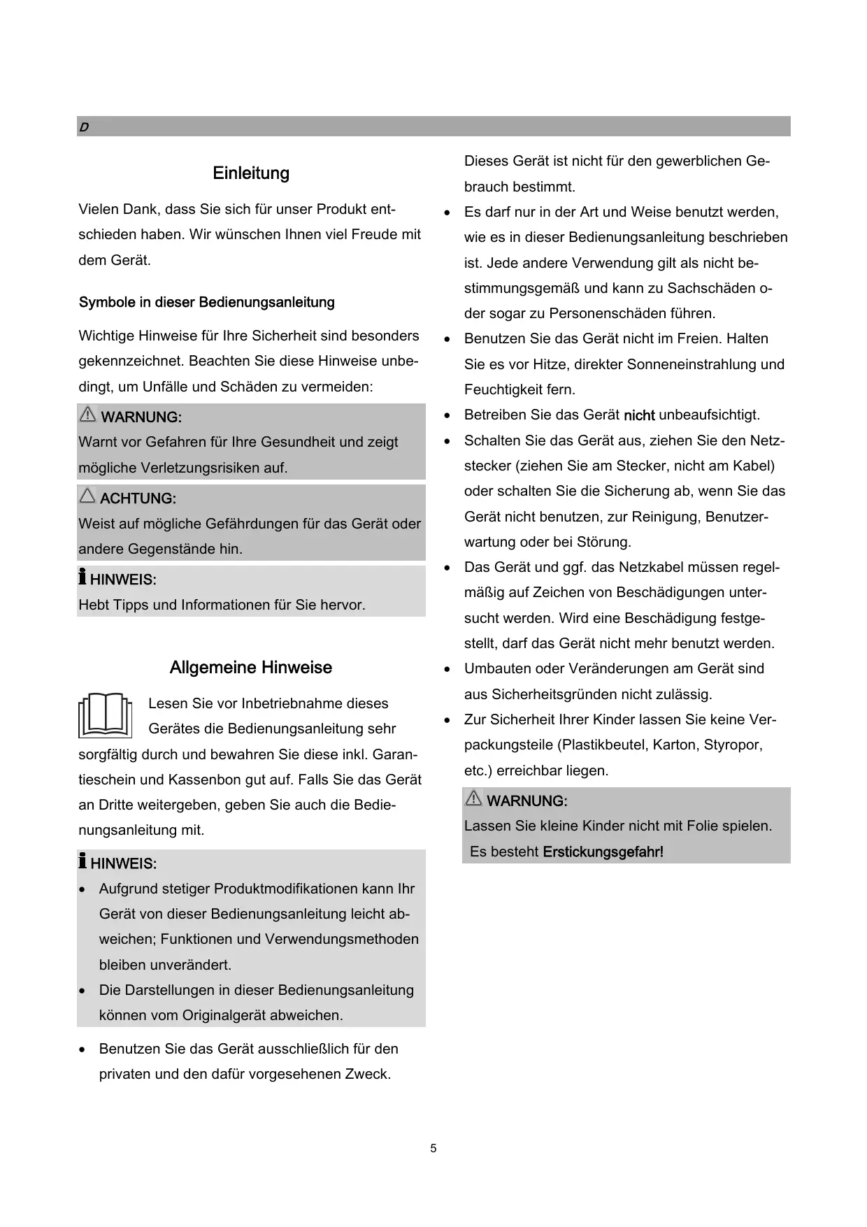 Einleitung Vielen Dank, dass Sie sich für unser Produkt ent- schieden haben. Wir wünschen Ihnen viel Freude mit dem Gerät. Symbole in dieser Bedienungsanleitung Wichtige Hinweise für Ihre Sicherheit sind besonders gekennzeichnet. Beachten Sie diese Hinweise unbe- dingt, um Unfälle und Schäden zu vermeiden: À WARNUNG: Warnt vor Gefahren für Ihre Gesundheit und zeigt môgliche Verletzungsrisiken auf. L\ ACHTUNG: Weist auf môgliche Gefährdungen für das Gerät oder andere Gegenstände hin. É HINWEIS: Hebt Tipps und Informationen für Sie hervor. Allgemeine Hinweise Lesen Sie vor Inbetriebnahme dieses Gerätes die Bedienungsanleitung sehr sorgfe ig durch und bewahren Sie diese inkl. Garan- tieschein und Kassenbon gut auf. Falls Sie das Gerät an Dritte weitergeben, geben Sie auch die Bedie- nungsanleitung mit. L HINWEIS: + Aufgrund stetiger Produktmodifikationen kann Ihr Gerät von dieser Bedienungsanleitung leicht ab- weichen; Funktionen und Verwendungsmethoden bleiben unverändert. + Die Darstellungen in dieser Bedienungsanleitung kônnen vom Originalgerät abweichen. + Benutzen Sie das Gerät ausschlieRlich für den privaten und den dafür vorgesehenen Zweck. Dieses Gerät ist nicht für den gewerblichen Ge- brauch bestimmt. Es darf nur in der Art und Weise benutzt werden, wie es in dieser Bedienungsanleitung beschrieben ist. Jede andere Verwendung gilt als nicht be- stimmungsgemäR und kann zu Sachschäden o- der sogar zu Personenschäden führen. Benutzen Sie das Gerät nicht im Freien. Halten Sie es vor Hitze, direkter Sonneneinstrahlung und Feuchtigkeit fern. Betreiben Sie das Gerät nicht unbeaufsichtigt. Schalten Sie das Gerät aus, ziehen Sie den Netz- stecker (ziehen Sie am Stecker, nicht am Kabel) oder schalten Sie die Sicherung ab, wenn Sie das Gerät nicht benutzen, zur Reinigung, Benutzer- wartung oder bei Stôrung. Das Gerät und ggf. das Netzkabel müssen regel- mäig auf Zeichen von Beschädigungen unter- sucht werden. Wird eine Beschädigung festge- stellt, darf das Gerät nicht mehr benutzt werden. Umbauten oder Veränderungen am Gerät sind aus Sicherheitsgründen nicht zulässig. Zur Sicherheit Ihrer Kinder lassen Sie keine Ver- packungsteile (Plastikbeutel, Karton, Styropor, etc.) erreichbar liegen. À WARNUNG: Lassen Sie kleine Kinder nicht mit Folie spielen. Es besteht Erstickungsgefahr!