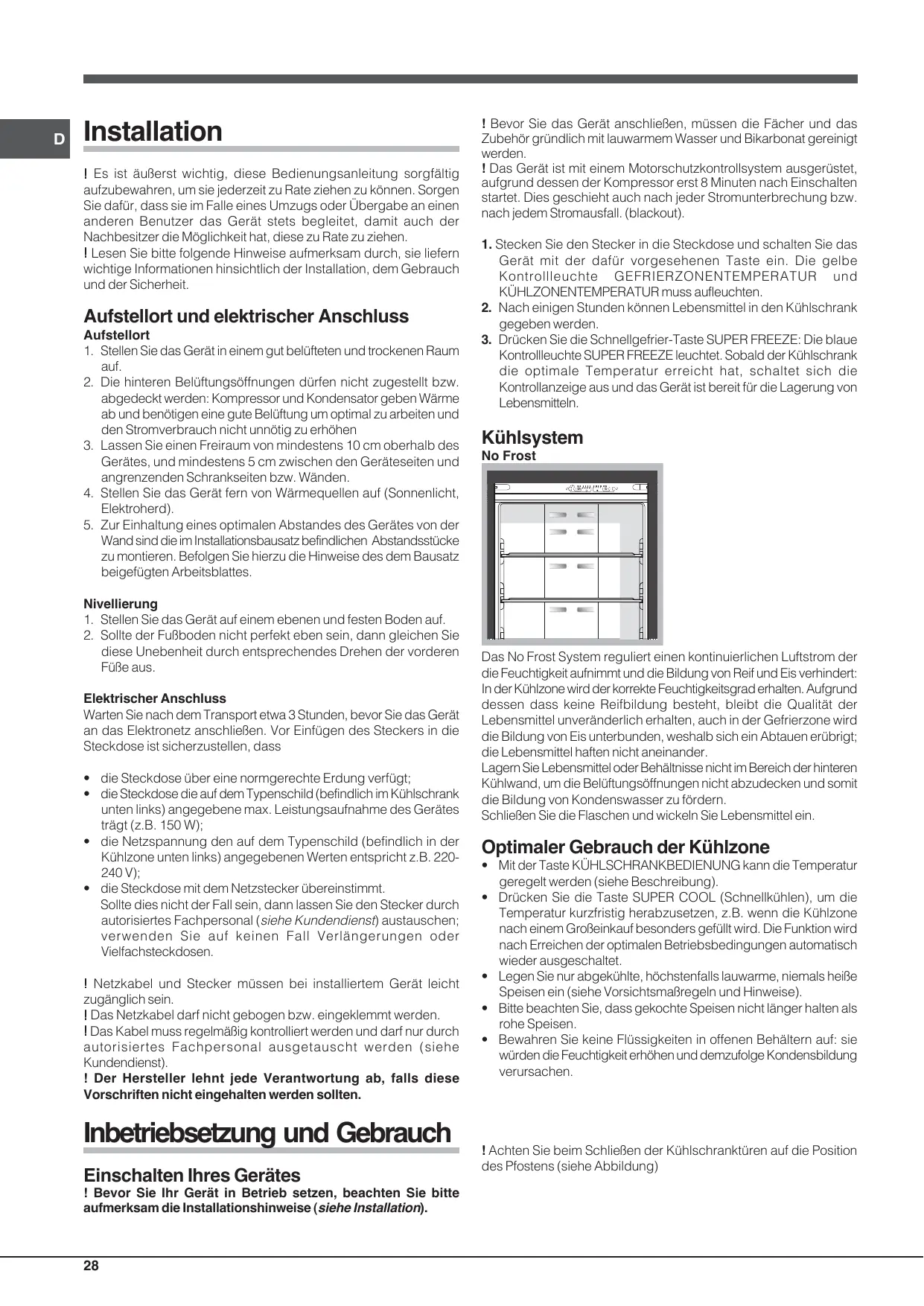 à l’intérieur du compartiment réfrigérateur et, grâce à l’absence de givre, il préserve les qualités originaires des aliments; dans le compartiment congélateur il évite la formation de glace, il n’y a par conséquent plus besoin de dégivrer et les aliments ne collent plus entre eux. Ne placez pas d’aliments ou de récipients contre la paroi refroidissante arrière pour ne pas boucher les trous d’aération et éviter une formation rapide d’eau condensée. Fermez bien les bouteilles et emballez les aliments.