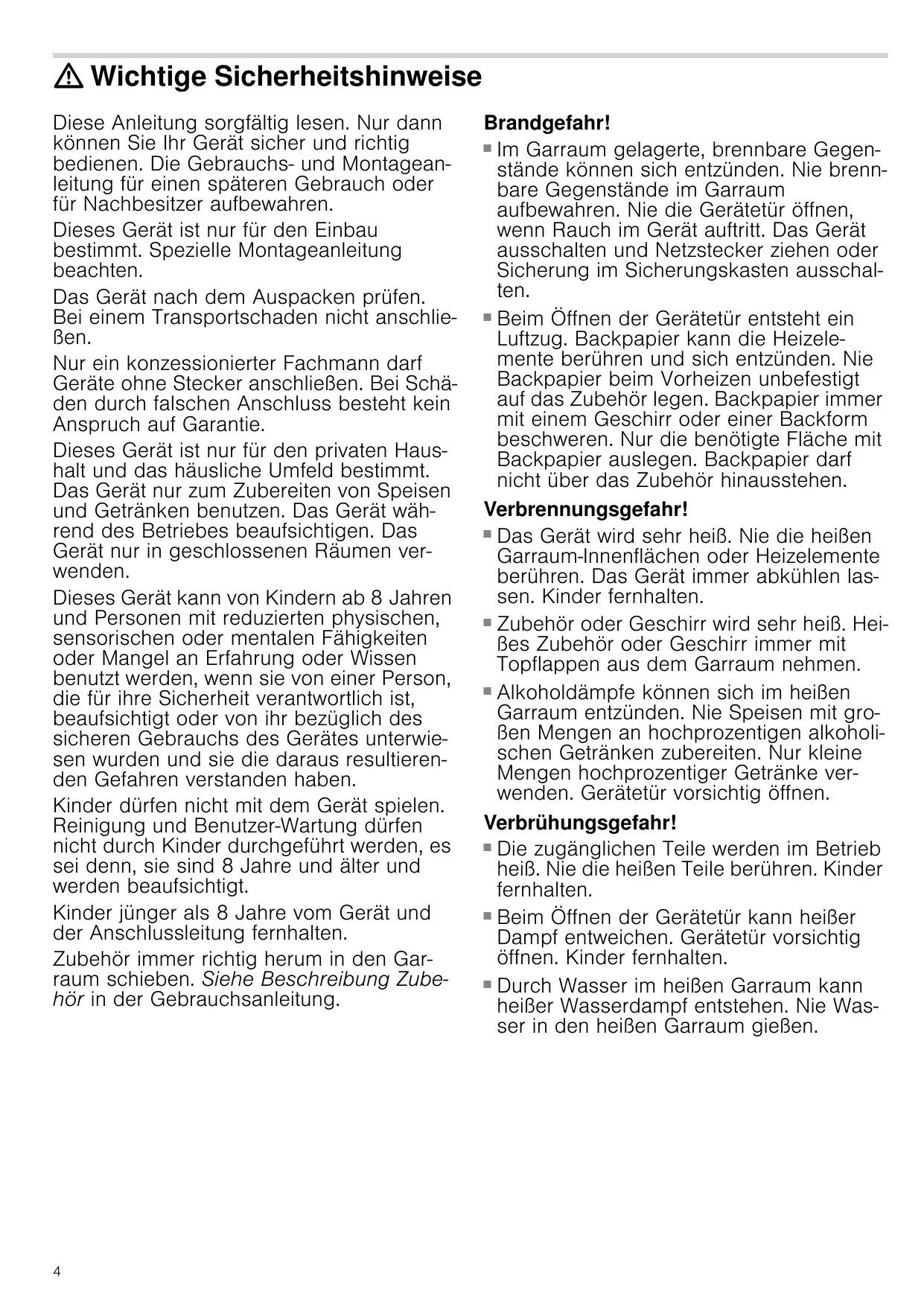 : Wichtige Sicherheitshinweise Diese Anleitung sorgfältig lesen. Nur dann können Sie Ihr Gerät sicher und richtig bedienen. Die Gebrauchs- und Montageanleitung für einen späteren Gebrauch oder für Nachbesitzer aufbewahren. Dieses Gerät ist nur für den Einbau bestimmt. Spezielle Montageanleitung beachten. Das Gerät nach dem Auspacken prüfen. Bei einem Transportschaden nicht anschließen. Nur ein konzessionierter Fachmann darf Geräte ohne Stecker anschließen. Bei Schäden durch falschen Anschluss besteht kein Anspruch auf Garantie. Dieses Gerät ist nur für den privaten Haushalt und das häusliche Umfeld bestimmt. Das Gerät nur zum Zubereiten von Speisen und Getränken benutzen. Das Gerät während des Betriebes beaufsichtigen. Das Gerät nur in geschlossenen Räumen verwenden. Dieses Gerät kann von Kindern ab 8 Jahren und Personen mit reduzierten physischen, sensorischen oder mentalen Fähigkeiten oder Mangel an Erfahrung oder Wissen benutzt werden, wenn sie von einer Person, die für ihre Sicherheit verantwortlich ist, beaufsichtigt oder von ihr bezüglich des sicheren Gebrauchs des Gerätes unterwiesen wurden und sie die daraus resultierenden Gefahren verstanden haben. Kinder dürfen nicht mit dem Gerät spielen. Reinigung und Benutzer-Wartung dürfen nicht durch Kinder durchgeführt werden, es sei denn, sie sind 8 Jahre und älter und werden beaufsichtigt. Kinder jünger als 8 Jahre vom Gerät und der Anschlussleitung fernhalten. Zubehör immer richtig herum in den Garraum schieben. Siehe Beschreibung Zubehör in der Gebrauchsanleitung.
