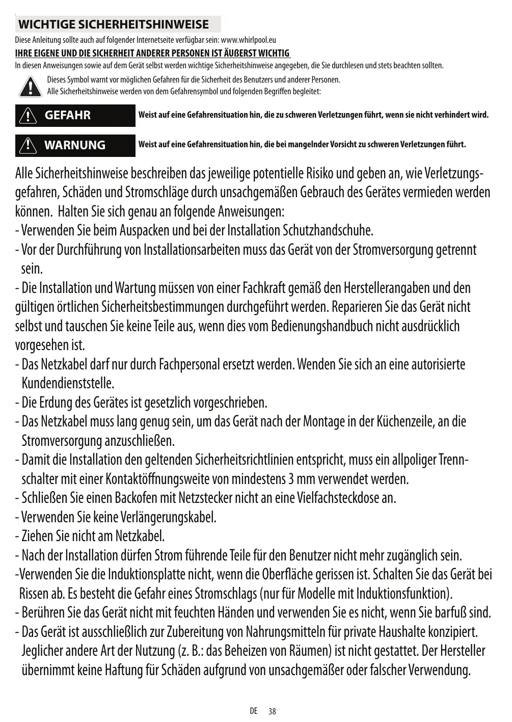 WICHTIGE SICHERHEITSHINWEISE Diese Anleitung sollte auch auf folgender Internetseite verfügbar sein: www.whirlpool.eu